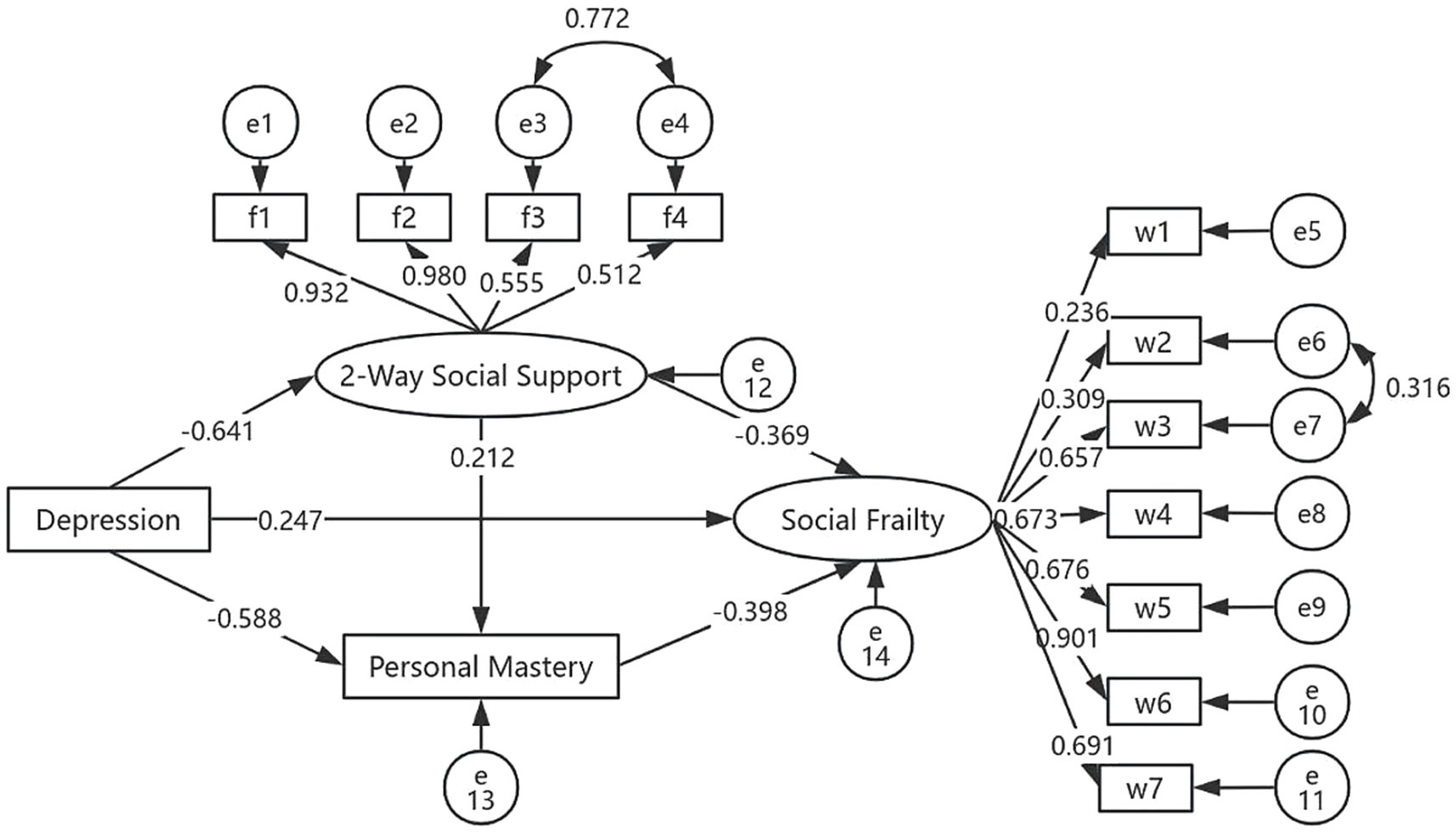 The correlation analysis revealed significant associations among depression, bidirectional social support, personal mastery, and social frailty, which fulfilled the prerequisite for testing mediation effects. In this study, an initial structural equation model (SEM) was constructed, with depression as the independent (observed) variable, bidirectional social support and personal mastery as mediators, and social frailty as the dependent variable. The initial model exhibited poor fit and was subsequently revised. The revised model demonstrated acceptable fit indices: x2/df = 4.003, RMSEA = 0.08, GFI = 0.908, NFI = 0.918, CFI = 0.917, and IFI = 0.918, indicating a good model fit. The finalized model is presented in Figure 2.