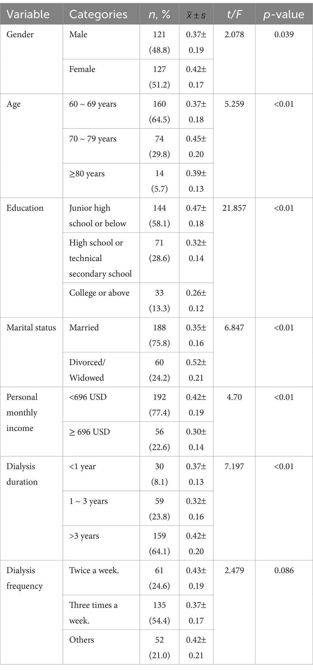 Among the 248 elderly maintenance hemodialysis (MHD) patients, the majority were female (51.2%), aged between 60 and 88 years (67.23 6.92), had an education level of junior high school or below (58.1%), were married (75.8%), reported a monthly income below 5,000 yuan (77.4%), had undergone dialysis for more than 3 years (64.1%), and received dialysis thrice weekly (54.4%). Statistically significant differences in social frailty scores were observed among elderly MHD patients based on age, education level, marital status, personal monthly income, and dialysis duration (p < 0.05). In contrast, differences related to gender and dialysis frequency were not statistically significant (p > 0.05), as shown in Table 1.