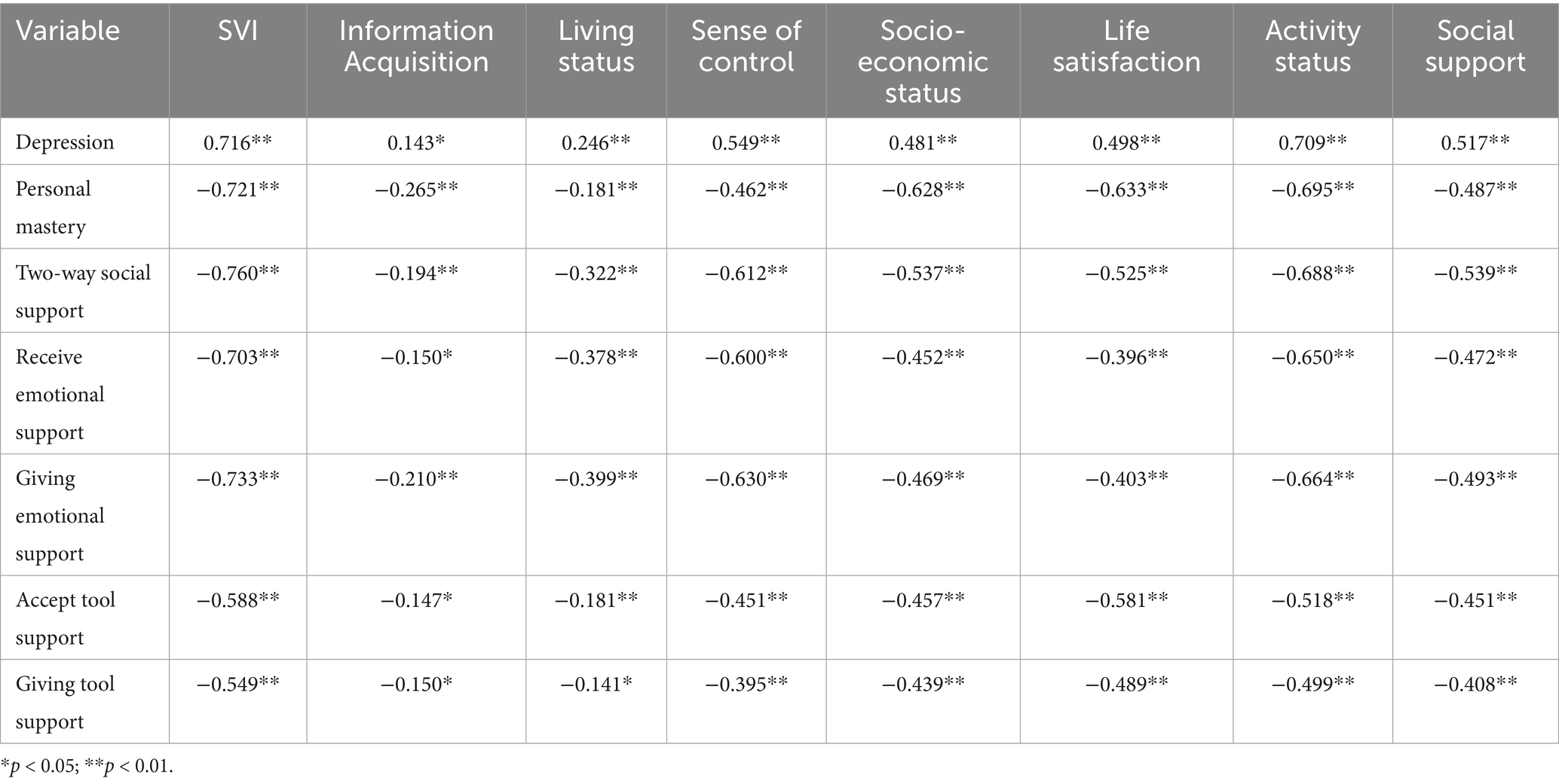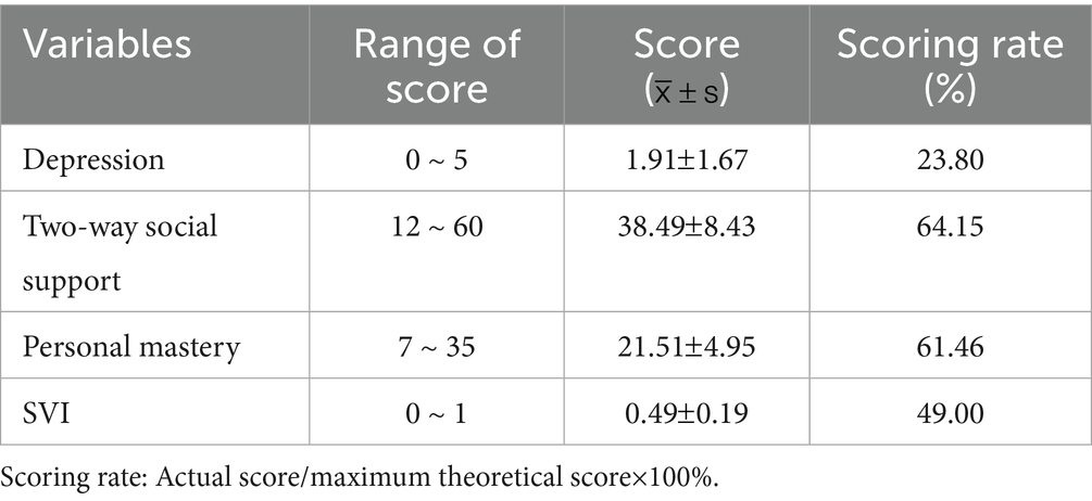 The SVI was originally developed by Andrew et al. (26) and later translated into Chinese by Bai Hui-Qiong et al. (27). It is primarily used to assess social frailty among older adults. The instrument comprises 32 items across seven dimensions: access to information, living situation, sense of control over life, socioeconomic status, life satisfaction, activity level, and social support. Items are scored using dichotomous or trichotomous formats. The total score ranges from 0 to 32, and the index score is calculated by dividing the total score by the number of items, yielding a value between 0 and 1. A total score ≥0.5 indicates moderate to severe social frailty. Higher SVI scores reflect greater levels of social frailty. In the present study, the scale demonstrated acceptable internal consistency, with a Cronbach’s alpha coefficient of 0.76.