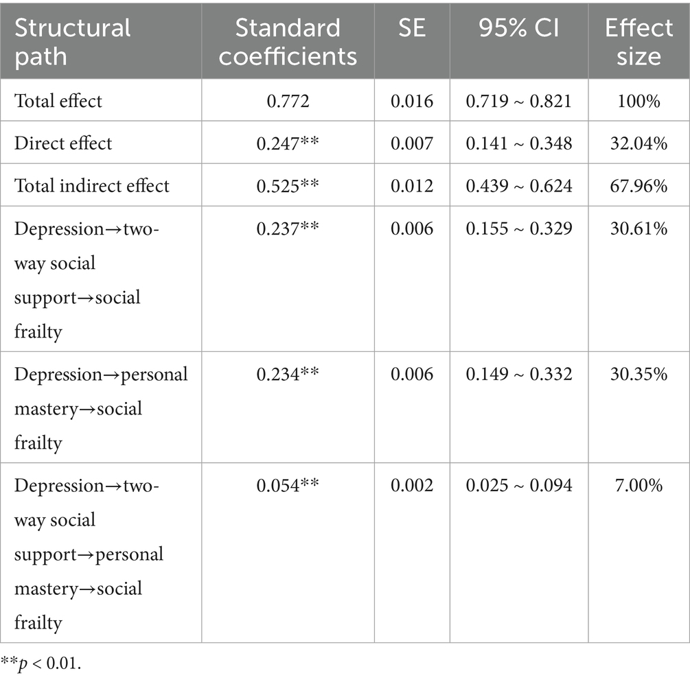 The bootstrap method with 2000 resamples was employed to assess the mediating effects on social frailty. The analysis revealed that the multiple mediating effects of bidirectional social support and personal mastery were statistically significant. Both variables served as partial mediators between depression and social frailty among elderly MHD patients. Specifically: (1) the total indirect effect accounted for 67.96% of the total effect; (2) the direct effect accounted for 32.04%; (3) the indirect effect via “depression → two-way social support → social frailty” accounted for 30.61%; (4) the indirect effect via “depression → personal mastery → social frailty” accounted for 30.35%; (5) the chain mediation effect via “depression → two-way social support → personal mastery → social frailty” accounted for 7.00%; and (6) the total effect of depression on social frailty was 0.771, while the inclusion of bidirectional social support and personal mastery in the model yielded a standardized direct effect of 0.247, as detailed in Table 4.