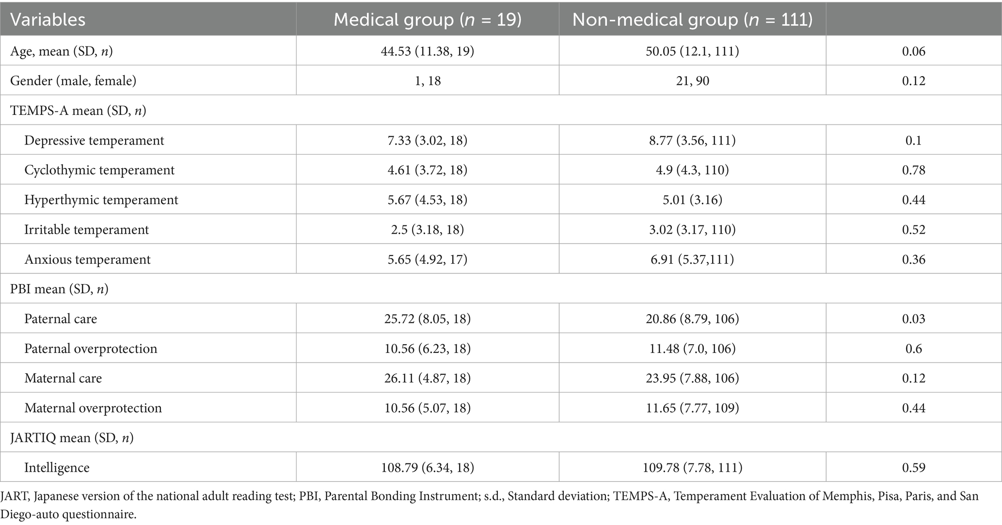 Among the 130 participants, 19 were from the medical group, including seven nurses, three social workers, two psychotherapists, two occupational therapists, two public health nurses, two medical students, and one medical doctor. The remaining 111 individuals were from the non-medical group, including 27 office workers, 11 housewives, 10 part-time workers, 8 public servants, etc. The medical group included 18 women and only 1 man, whereas the non-medical group included 90 women and 21 men. However, gender was not significantly different (χ2 = 2.15, p = 0.142). The medical group also had significantly higher paternal care scores than the non-medical group (Table 1).