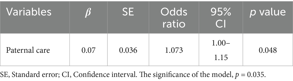 As previously mentioned, binomial logistic regression analysis using the likelihood ratio and forward method was performed, with medical professional choice as the dependent variable and potentially significant variables, which showed p < 0.2 in the t-test or χ2 test as independent variables they were gender, age, depressive temperament, paternal care, and maternal care. As a result, only paternal care remained significant in the final model (Table 2).