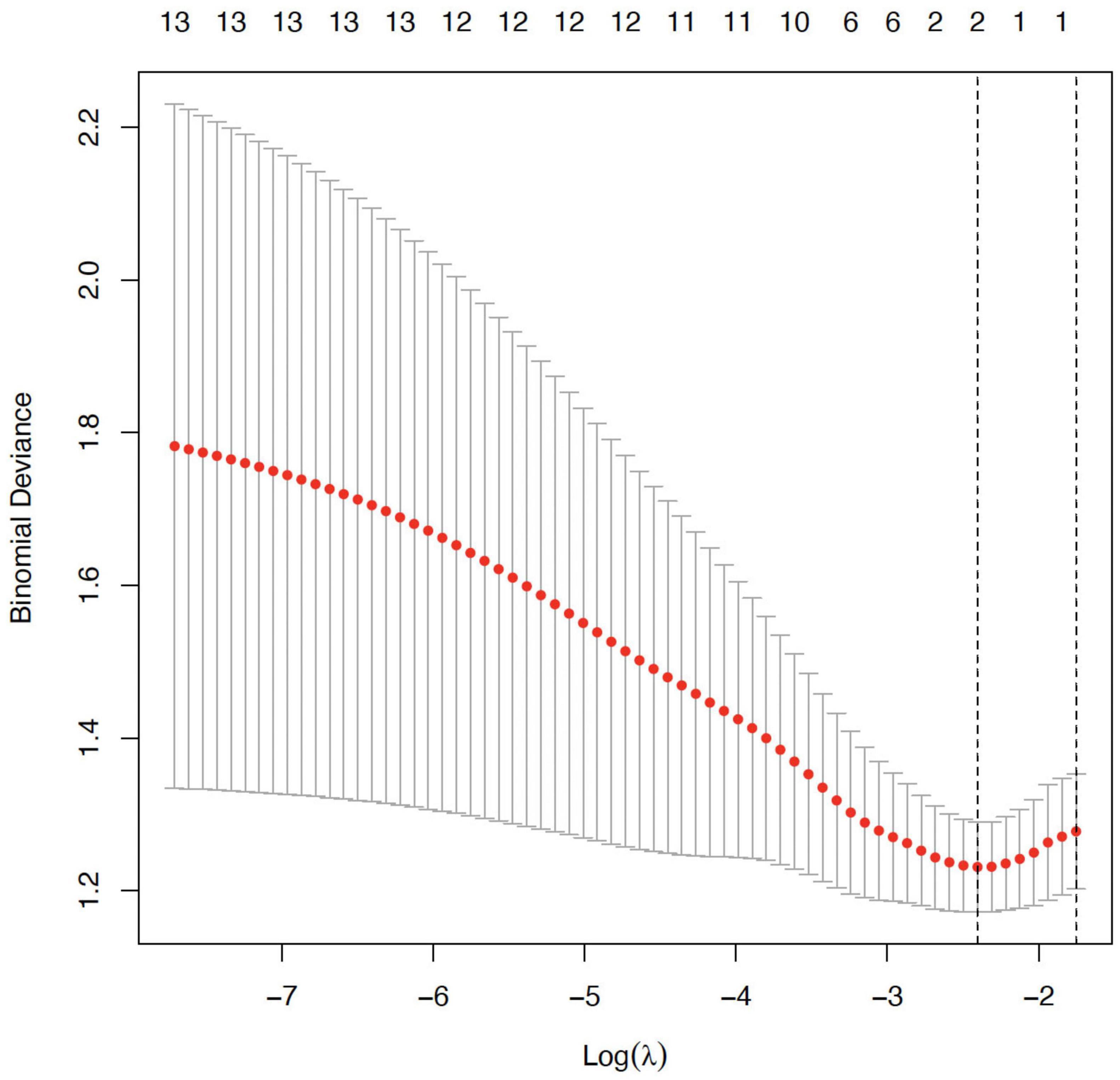 The 10-fold cross-validation error (binomial deviation) curve for various λ values is shown in this graphic. The ideal balance between model complexity and prediction error is indicated by the vertical dotted line on the left, which shows the value of λ that minimizes the cross-validated error (λ_min). Six variables in all were chosen for additional modeling at this ideal λ. We chose λ_min to optimize predictive information, even if the right vertical line (optional λ_1se) is more conservative and contains fewer variables. The optimal value of λ was determined through 10-fold cross-validation, as illustrated in Figure 2, which shows the binomial deviation curve and the corresponding λ values.