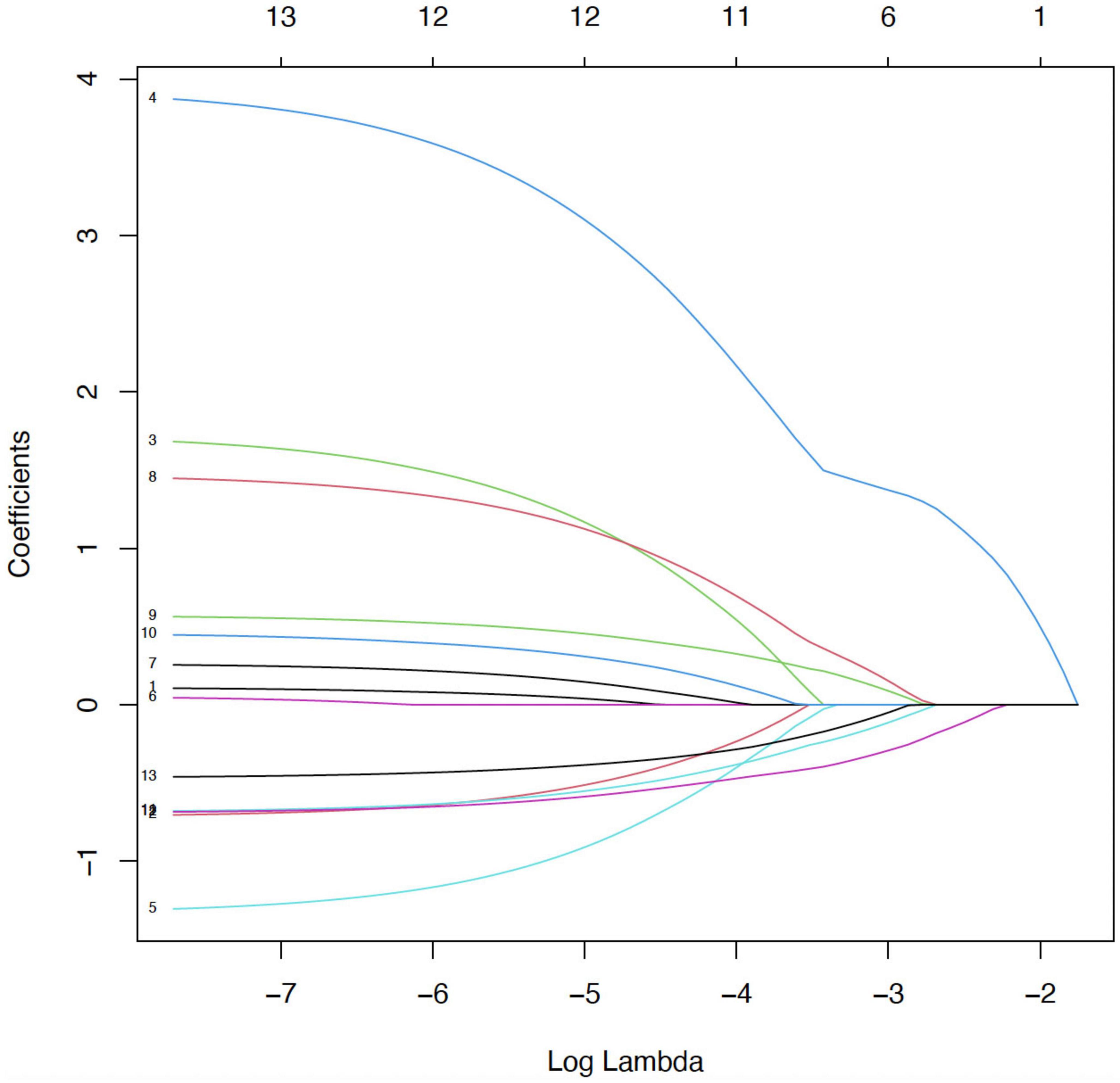 This Figure 1 shows the LASSO coefficient profiles of all candidate predictors as a function of the logarithmic value of the regularization parameter λ. As λ increases (moving left to right), more coefficients shrink toward zero, indicating regularization strength. When log(λ) is sufficiently high, only a few variables remain with non-zero coefficients. This penalization process helps eliminate redundant or weakly associated variables. In our analysis, 13 variables initially entered the model, but as λ increased, only six variables retained non-zero coefficients, suggesting their stronger association with the outcome of postoperative pain relief.