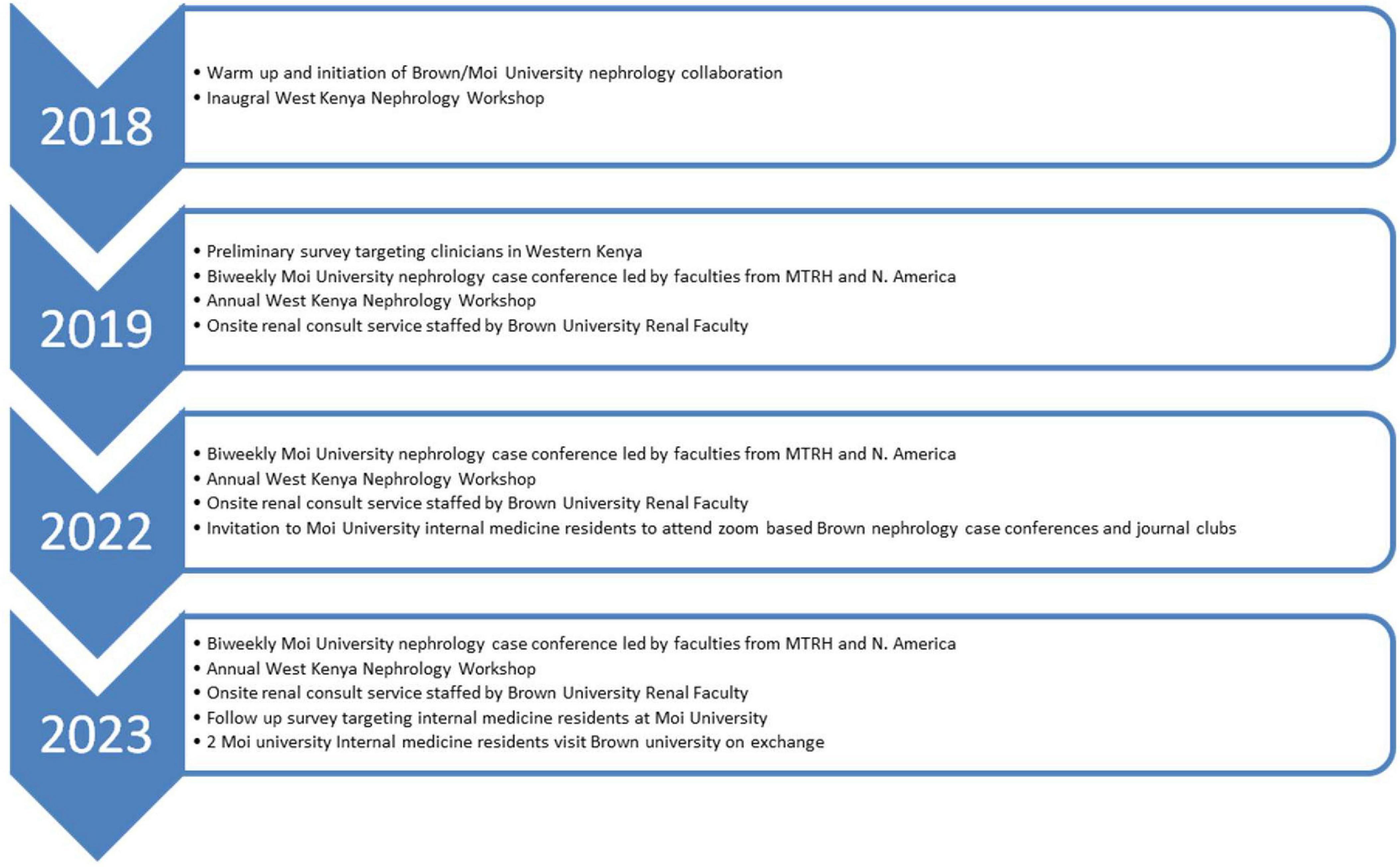 Figure 1. Depiction of key milestones in the Brown/Moi University nephrology education collaboration between 2018 and 2023.