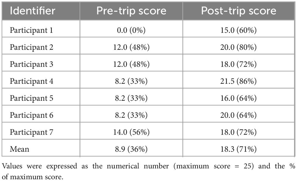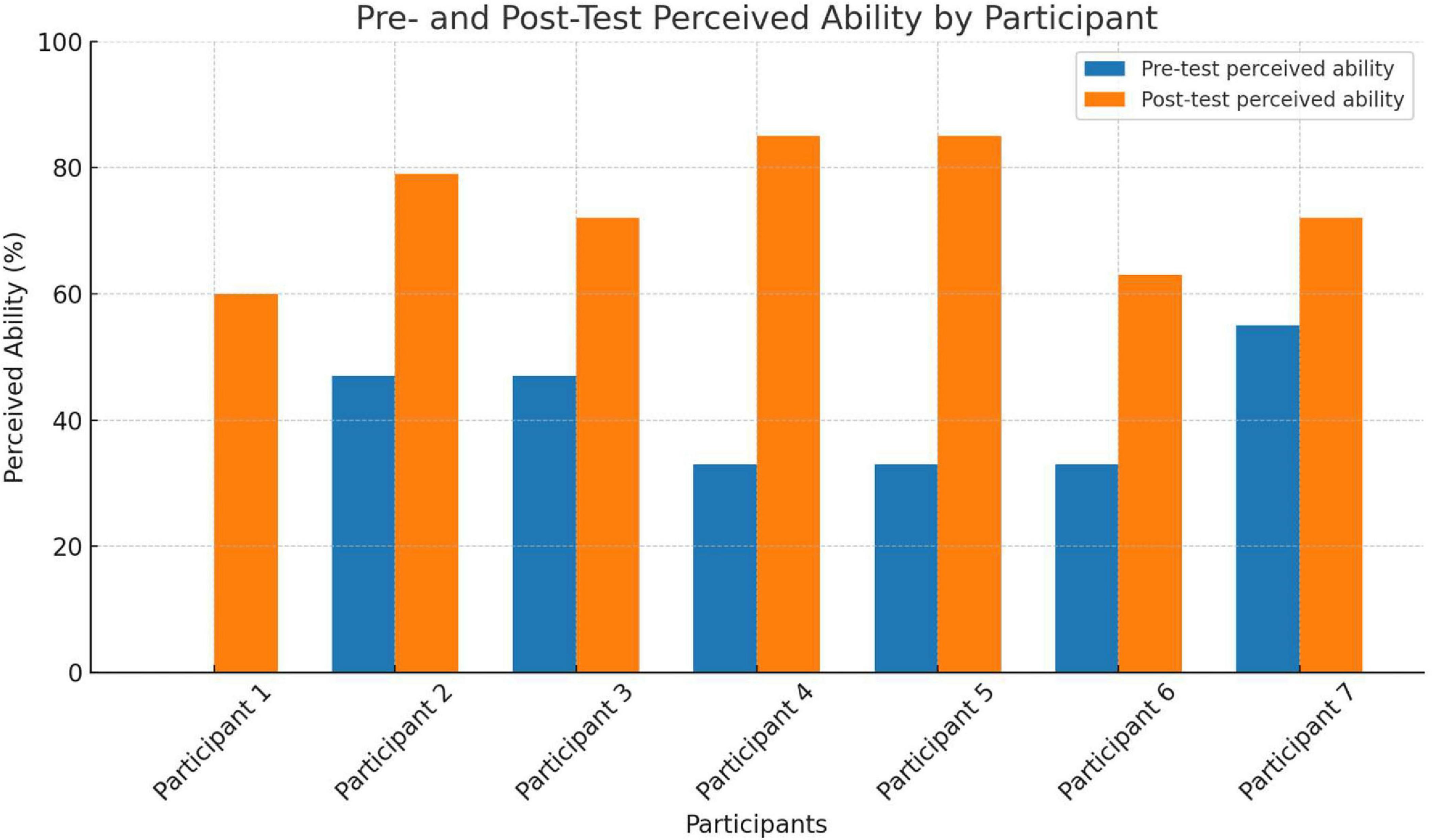 Seven nephrology fellows completed 3-week electives in Eldoret between 2019 and 2023. Pre- and post-elective surveys showed an increase in perceived competency, from 36.1 to 62.0% on average. Figure 4 and Table 2 illustrate individual score changes.