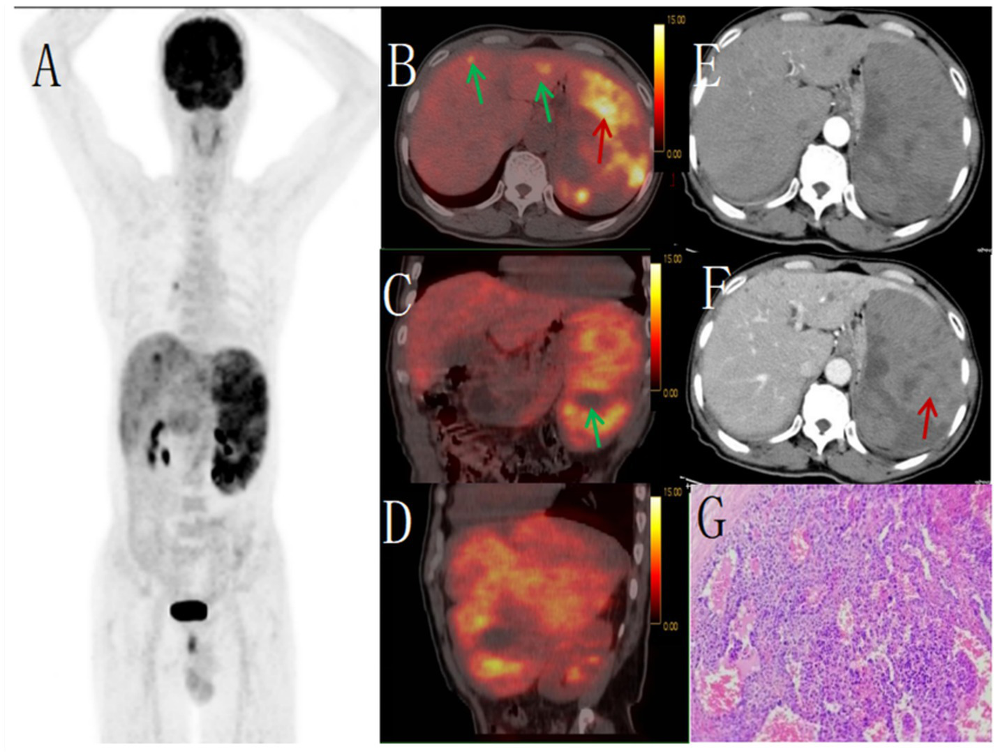 Male, 67 years old, primary splenic angiosarcoma. (A) whole body MIP, (B) axial fusion, (C) coronal fusion, (D) sagittal fusion, (E) enhanced CT-arterial phase, (F) enhanced CT-venous phase, (G) (H-E × 400). 18F-FDGPET/CT showed multiple nodular and massive lesions in the spleen with multiple necrotic areas, PET/CT images showed an abnormal increase in diffuse and uneven uptake of 18F-FDG in the spleen, with a SUVmax of 9.0 (red arrow, B) and no FDG uptake in some necrotic areas (green arrow, C). There were multiple nodular lesions in the liver, the level of FDG metabolism increased, the SUVmax was 5.6 (green arrow, B). Enhanced CT showed diffuse uneven mild enhancement of spleen, and the degree of enhancement increased with time (red arrow, F). Multiple nodular low-density shadows were seen in the liver, which were slightly enhanced by enhanced scan. PET/CT-guided splenic biopsy confirmed the diagnosis of primary splenic angiosarcoma (G).
