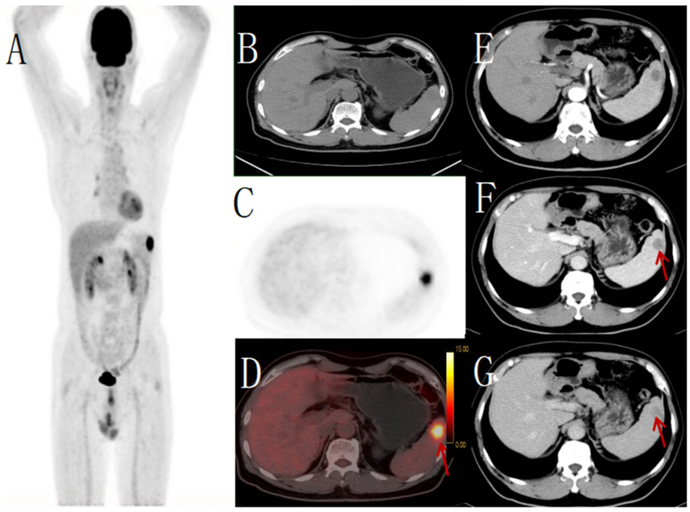 Male, 62 years old,metastatic tumor. (A) whole body MIP, (B) axial CT, (C) axial PET, (D) axial fusion, (E) enhanced CT-arterial phase, (F) enhanced CT-venous phase, (G) enhanced CT-delayed phase. 18F-FDG PET/CT revealed a round hypodense lesion (approximately 21 × 21 mm) with ill-defined margins in the upper pole of the spleen, demonstrating increased radiotracer uptake (SUVmax 11.5) (arrow, D). No other abnormal FDG-avid foci were detected elsewhere in the body. Contrast-enhanced CT showed a corresponding round slightly hypodense lesion within the splenic parenchyma, exhibiting mild peripheral enhancement (arrow, F,G). Pathological examination of the biopsy specimen confirmed the diagnosis of metastatic carcinoma.