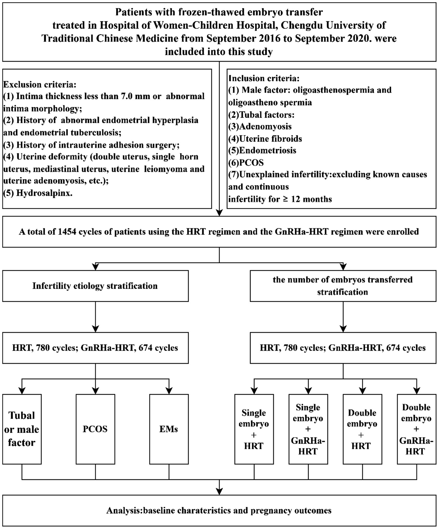 Figure 1. Data collection and analysis. HRT, hormone replacement therapy; GnRHa–HRT, gonadotropin-releasing hormone agonist–HRT; FET, frozen–thawed embryo transplantation; EMs, endometriosis; PCOS, polycystic ovary syndrome.