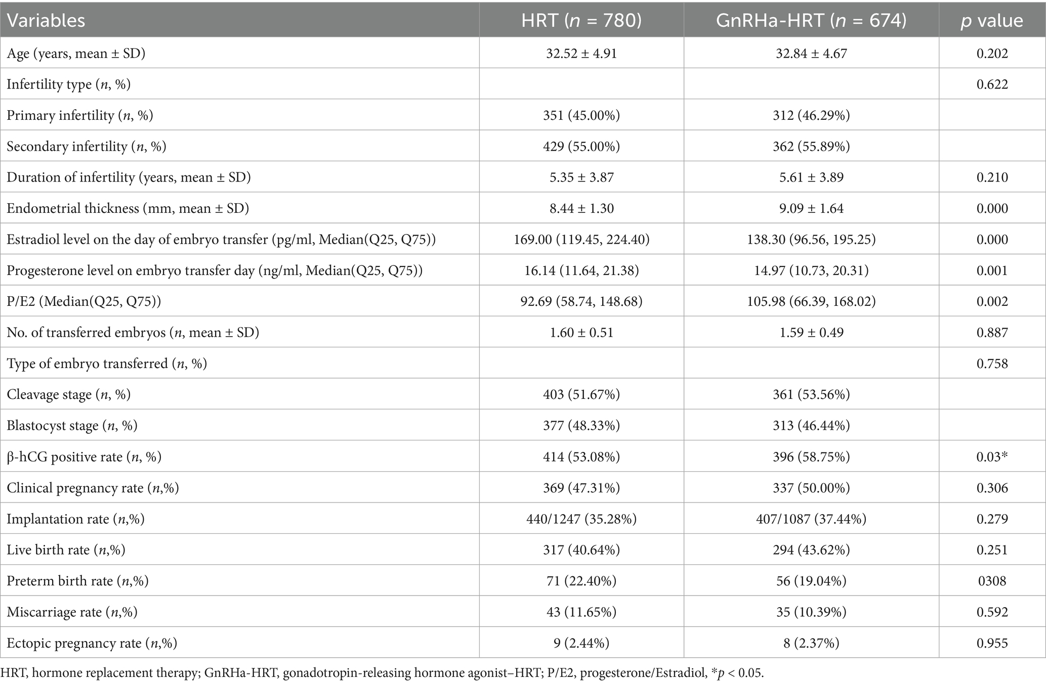 A total of 1,454 cycles with GnRHa pretreatment and HRT cycles were retrospectively analyzed. The initial characteristics of the patients were examined, revealing no substantial differences regarding maternal age, infertility type, infertility duration, and the type of embryo. Estrogen and progesterone levels were found to be higher in the HRT group than in the gonadotropin-releasing hormone analogue–HRT group on the day of transplantation in all patients studied (p < 0.05). Additionally, the progesterone-to-estrogen ratio in the HRT group was notably lower than in the GnRHa–HRT group, with all differences showing statistical significance (p < 0.05). On the day of the embryo transfer, the endometrial thickness was significantly lower in the HRT group than in the GnRHa–HRT group (p = 0.000). Positive-HCG in the HRT group was lower than in the GnRHa–HRT group (53.08% vs. 58.75%, p = 0.03), and implantation rate was lower than in the GnRHa–HRT group (35.28% vs. 37.44%, p = 0.279). In addition, there was no significant difference in clinical pregnancy rate, spontaneous abortion rate, ectopic pregnancy rate, live birth rate, and preterm birth rate (p > 0.05) (Table 1).