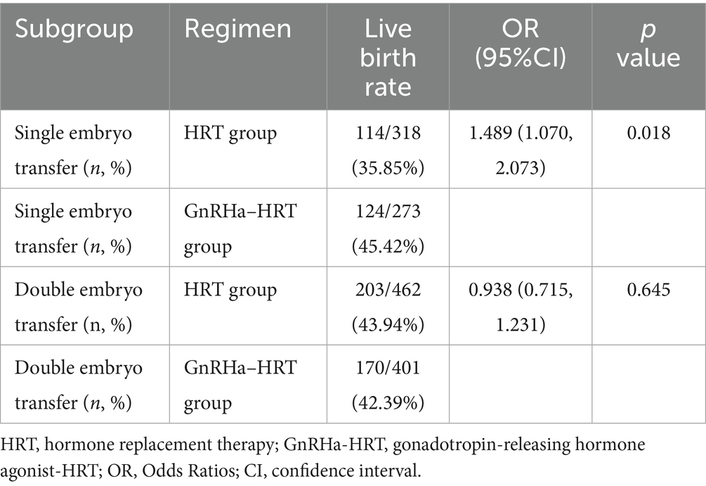 Hao et al. (8) found that the proportion of single embryo transfers was significantly higher in the GnRHa–HRT group. However, the study did not compare GnRHa–HRT pregnancy outcomes with HRT pregnancy outcomes by dividing single/ double embryo transfer. Our study found that the GnRHa–HRT significantly improves live birth rates compared to the conventional HRT in single-embryo transfer cycles. A statistically significant difference was found between the two groups (OR = 1.489; 95% CI: 1.070–2.073). Our finding of a higher rate of singleton pregnancy in the GnRHa–HRT group suggests a potential advantage of this protocol in achieving singleton pregnancies, which could help to meet the clinical goal of reducing multiple pregnancy risk.