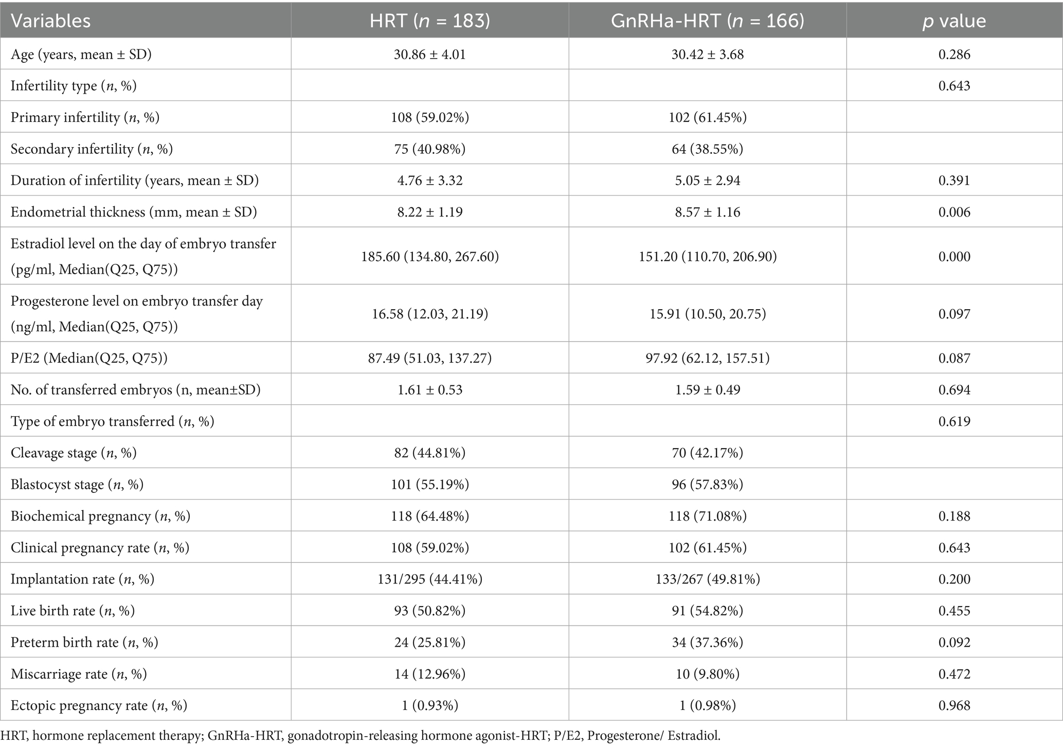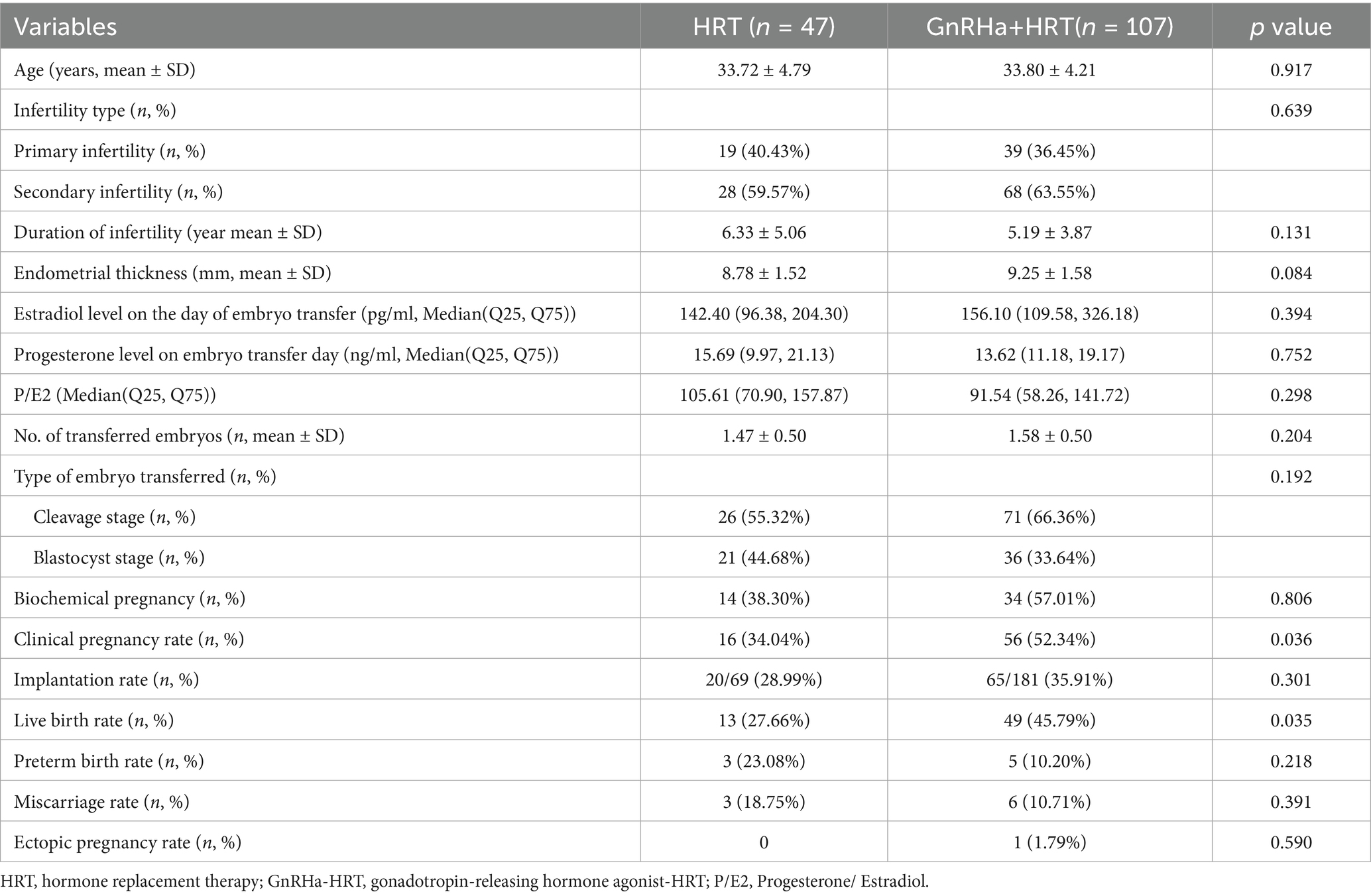 The proportion of frozen–thawed embryo transfers has increased dramatically due to advances in vitrification freezing technology (1). The application of frozen embryo transfer (FET) has become increasingly widespread due to multiple factors, including ovarian stimulation protocols under high progesterone conditions, elevated risks of ovarian hyperstimulation syndrome (OHSS), premature progesterone rise before oocyte retrieval, endometrial abnormalities in fresh cycles, and the use of preimplantation genetic screening. FET is no longer merely a supplementary option to fresh embryo transfer; it has evolved into a standard practice in IVF treatment (2, 3). In FET protocols, three main approaches are employed for endometrial preparation: standard hormone replacement therapy (HRT), gonadotropin-releasing hormone agonist (GnRHa) agonist-supplemented HRT cycles (GnRHa–HRT), and natural cycle monitoring (NC). The natural cycle protocol is generally reserved for ovulatory patients demonstrating regular menstrual cyclicity. However, this approach may result in premature or anovulation, a risk of mis-synchronization between the embryo and the endometrium, and a higher risk of cycle cancellation due to abnormal ovulation. The HRT cycle is more flexible and convenient. Pretreatment with GnRHa before HRT effectively suppresses premature ovulation, thereby avoiding cycle disruption while synchronizing endometrial development with exogenous progesterone administration (4). However, the impact of GnRHa on pregnancy outcome remains controversial. Research has demonstrated no significant differences between HRT and GnRHa concerning the clinical success rates of conception (5). However, other studies have shown that GnRHa–HRT regimens significantly improve pregnancy outcome (6, 7). To resolve the ongoing debate on whether GnRHa pretreatment improves FET outcomes, we conducted a single-center retrospective analysis.