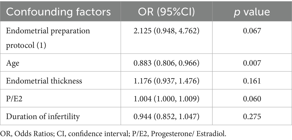 To further clarify the impact of the hormone replacement endometrial preparation protocol on the outcome of frozen–thawed embryo transfer, we conducted a correction for confounding factors and conducted the study in the endometriosis group. Binary logistic regression analysis further confirmed that age is an independent risk factor for live birth outcomes in patients with endometriosis (OR = 0.883, 95%CI:0.806–0.966, p = 0.007). GnRHa–HRT displayed a trend of increasing the live birth rate (OR = 2.125, 95%CI:0.948–4.762, p = 0.067), but the difference did not reach statistical significance. The endometrial thickness (p = 0.161) and duration of infertility (p = 0.275) had no significant impact on the live birth outcome. The P/E2 ratio shows a potential positive trend (p = 0.060), and further validation with a larger sample size is required (Table 6).