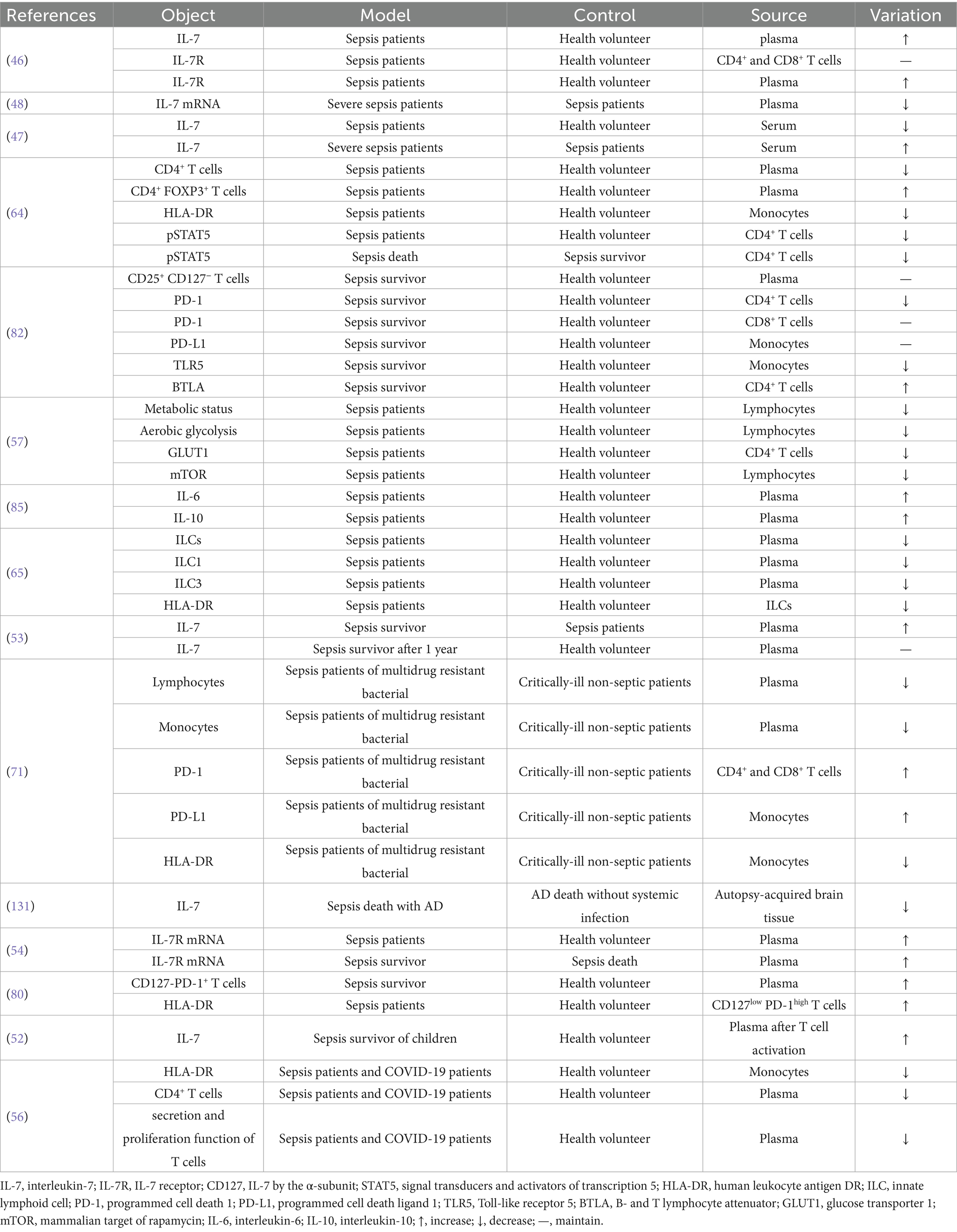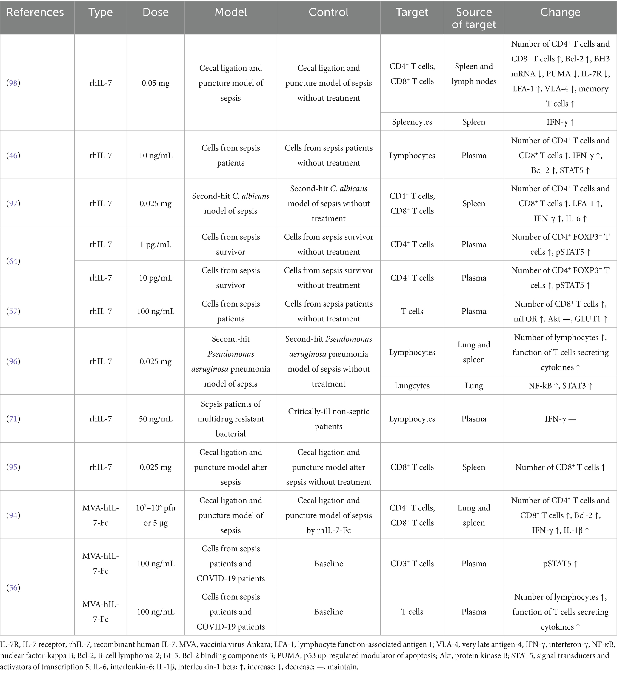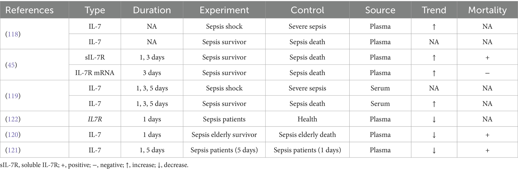 We included nine studies investigating the clinical application of IL-7 in sepsis (Tables 3, 4). We found that endogenous IL-7 in the blood may serve as a marker for assessing disease severity and prognosis in elderly patients with sepsis. Exogenous IL-7, such as rhIL-7, may represent a potential immunotherapeutic agent.