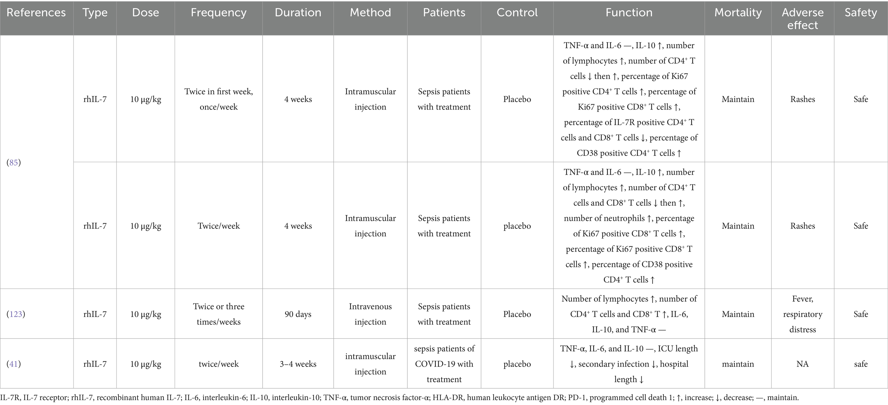 The typical dose of rhIL-7 is 10 μg/kg, administered once or twice weekly. Francois et al. (85) reported that intramuscular administration of rhIL-7 in patients with sepsis increased the number of lymphocytes and their subsets, as well as IL-10 levels; however, mortality remained unchanged, suggesting that immune recovery alone may be insufficient to reverse severe infection and organ damage. The only adverse effect observed was rashes, which resolved after discontinuing rhIL-7, indicating that intramuscular injection of rhIL-7 is safe. Intravenous administration of rhIL-7 results in higher blood concentrations compared to intramuscular injection. Patients receiving intravenous rhIL-7 experienced increased lymphocyte counts without cytokine storms. However, fever and respiratory distress may occur as potential side effects (123). Shankar-Hari et al. (41) reported that COVID-19 sepsis patients treated with rhIL-7 had shorter ICU and hospital stays and a lower risk of secondary infections, though mortality rates were unchanged. Administered at standard doses (10 μg/kg, weekly or biweekly) via intramuscular or intravenous routes, rhIL-7 safely increases lymphocyte subsets including CD4+/8+ T cells and modulates cytokines like IL-10, with manageable side effects like transient rashes and fever. However, clinical trials, including those involving COVID-19-associated sepsis, have not demonstrated a reduction in mortality, despite shorter ICU and hospital stays and a lower incidence of secondary infections.
