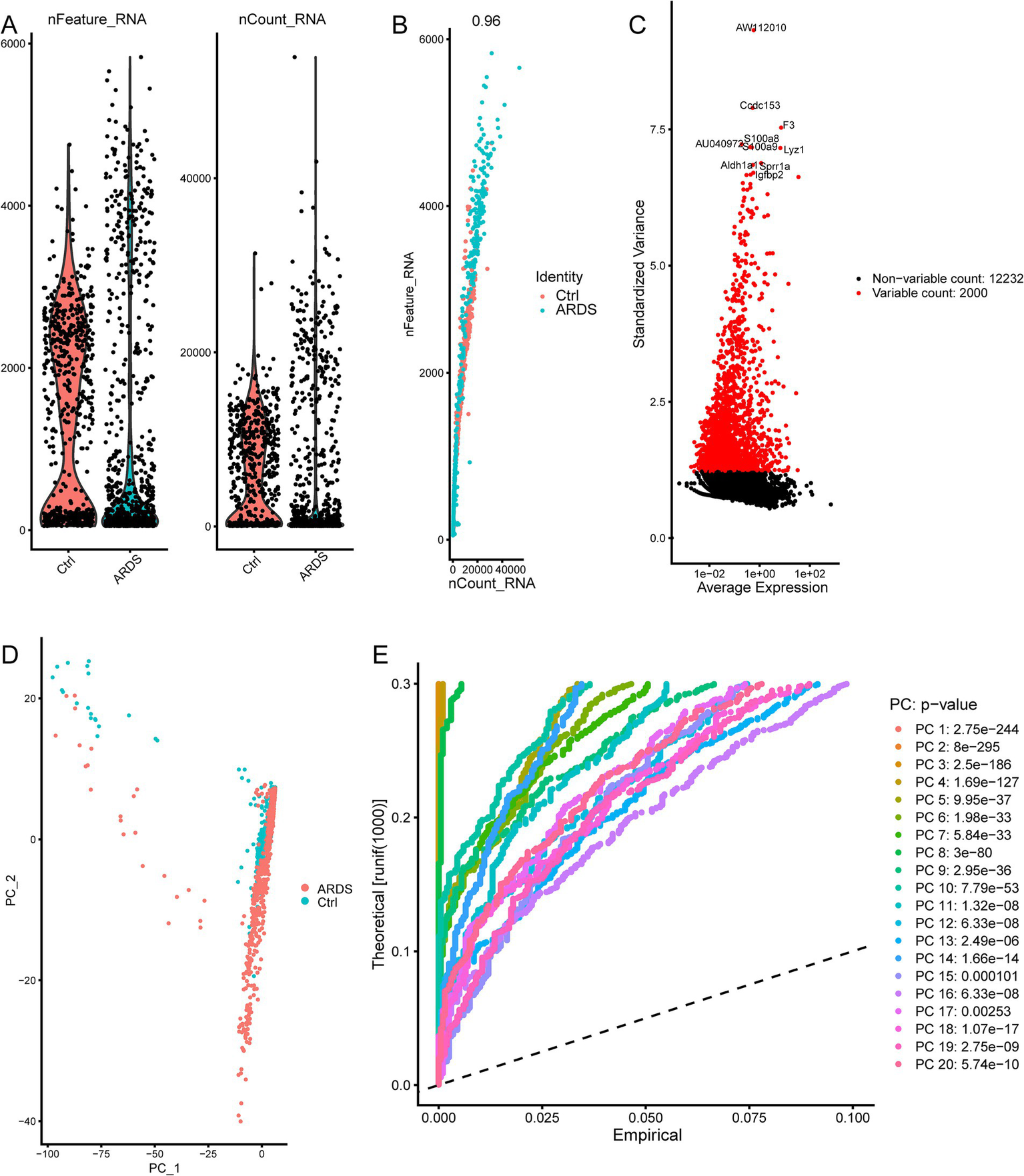 ARDS-related principal component genes were screened based on single-cell sequencing from the GSE132533 dataset. (A) Quality control of AT2 cells in ARDS. (B) The number of genes detected was significantly correlated with the depth of sequencing. (C) The variance diagram of gene expression. The red dots represent highly variable genes, and the black dots represent non-variable genes. (D) Principal component analysis (PCA) demonstrates no significant separations of cells between ARDS and control. (E) PCA identified 20 significant principal components (PCs).