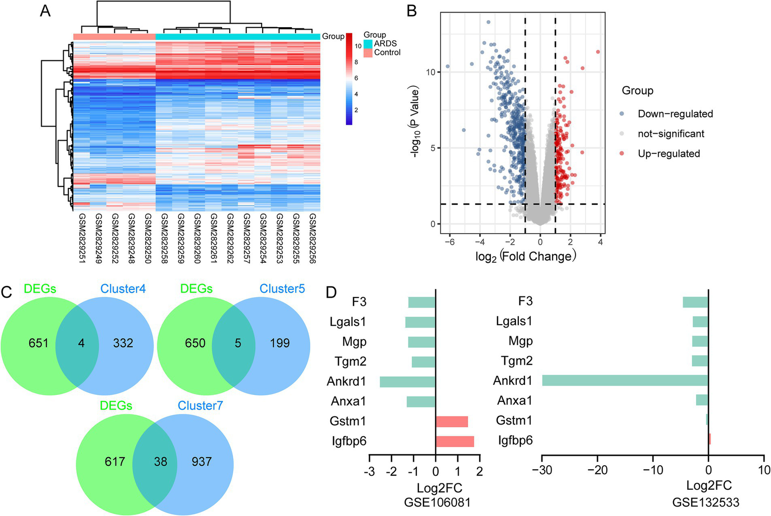 Identification of branch marker genes based on the GSE106081 dataset. (A) Heatmap of differentially expressed genes between ARDS and control in GSE106081 dataset. (B) Volcano map of differentially expressed genes between ARDS and control in GSE106081 dataset. (C) Intersection of differentially expressed genes with clusters. (D) Differential expression of key genes between ARDS and control in GSE106081 and GSE132533 datasets.