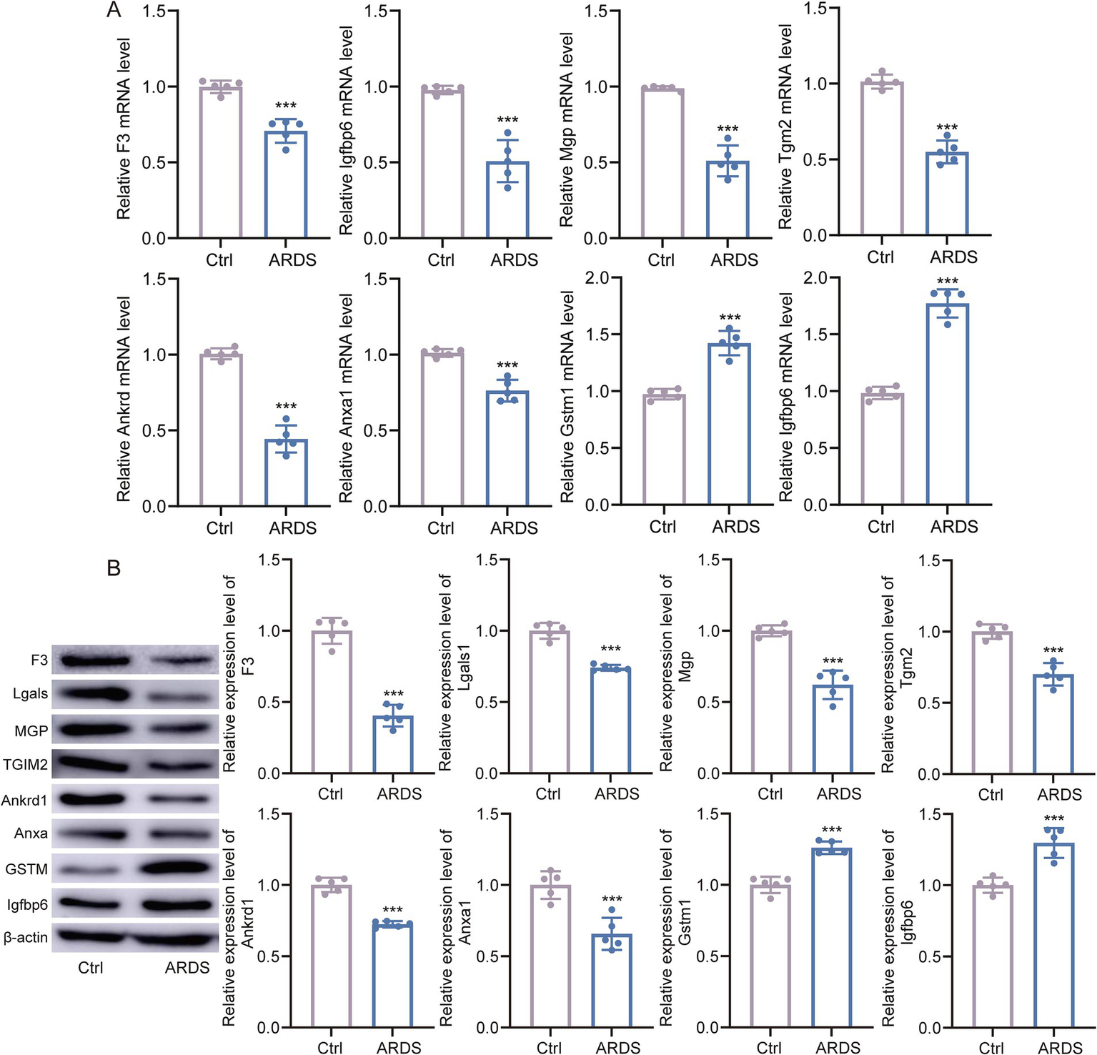 To verify the expression of marker genes in ARDS, we collected BALF from ARDS patients and healthy controls. The qRT-PCR results showed that, compared with controls, Gstm1 and Igfbp6 were significantly upregulated in ARDS patients, whereas F3, Lgals1, Mgp, Tgm2, Ankrd1, and Anxa1 were significantly downregulated (Figure 6A). Importantly, the trends in protein levels closely paralleled those observed at the mRNA level (Figure 6B), supporting the translational relevance of our transcriptomic findings.