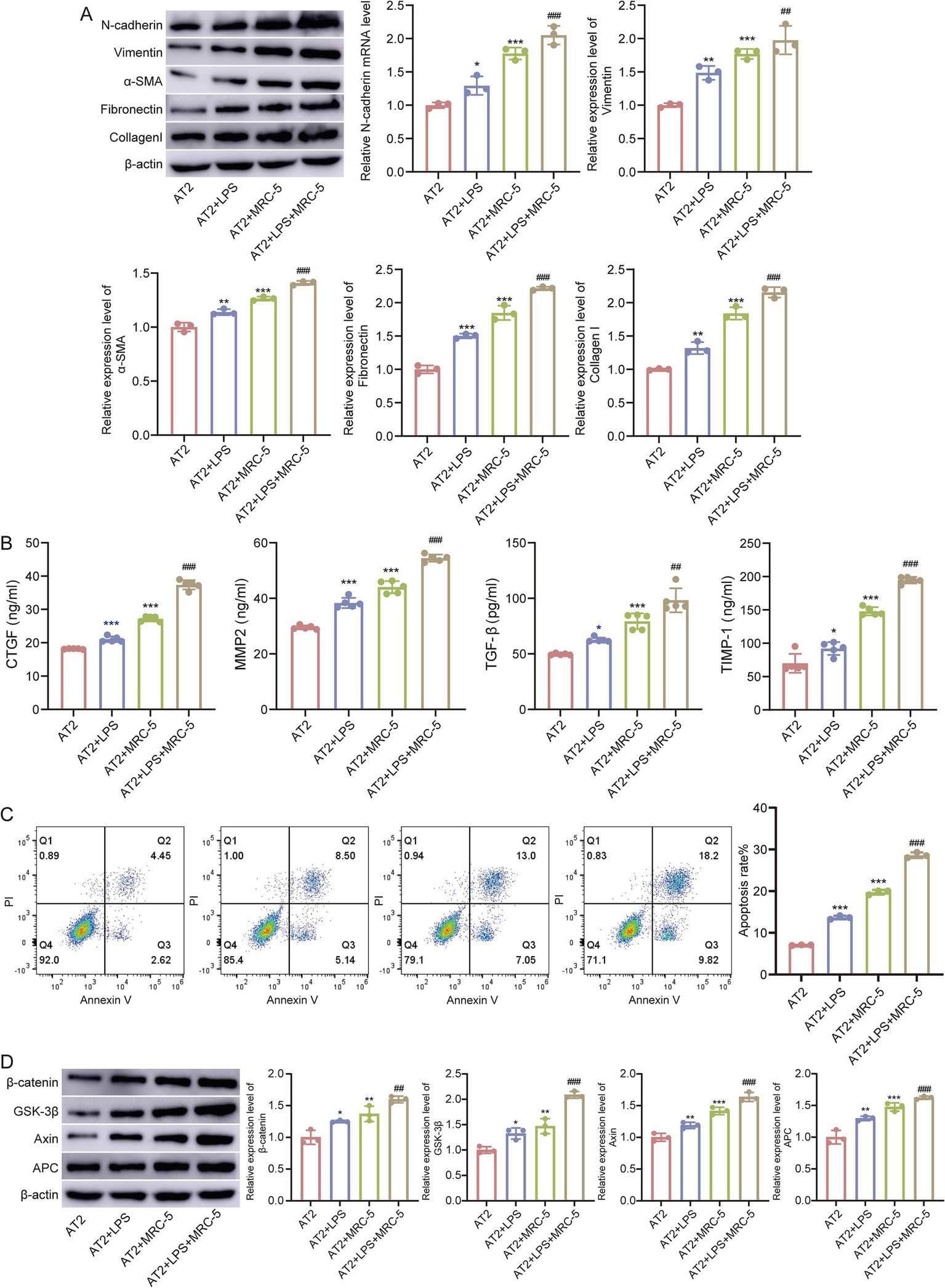 Epithelial injury drives fibrosis-like remodeling. (A) Western blot analysis of N-cadherin, vimentin, α-SMA, fibronectin, and collagen l across four groups (AT2, AT2+LPS, AT2+MRC-5, and AT2+LPS+MRC-5). (B) ELISA quantification of CTGF, MMP2, TGF-β, and TIMP-1 in culture supernatants. (C) Flow cytometric apoptosis (early/late) of AT2 cells. (D) Western blot analysis of β-catenin, GSK-3β, Axin, and APC. β-actin served as the internal control. Compared with AT2, **p < 0.01, ***p < 0.001, compared with AT2+LPS ###p < 0.001.