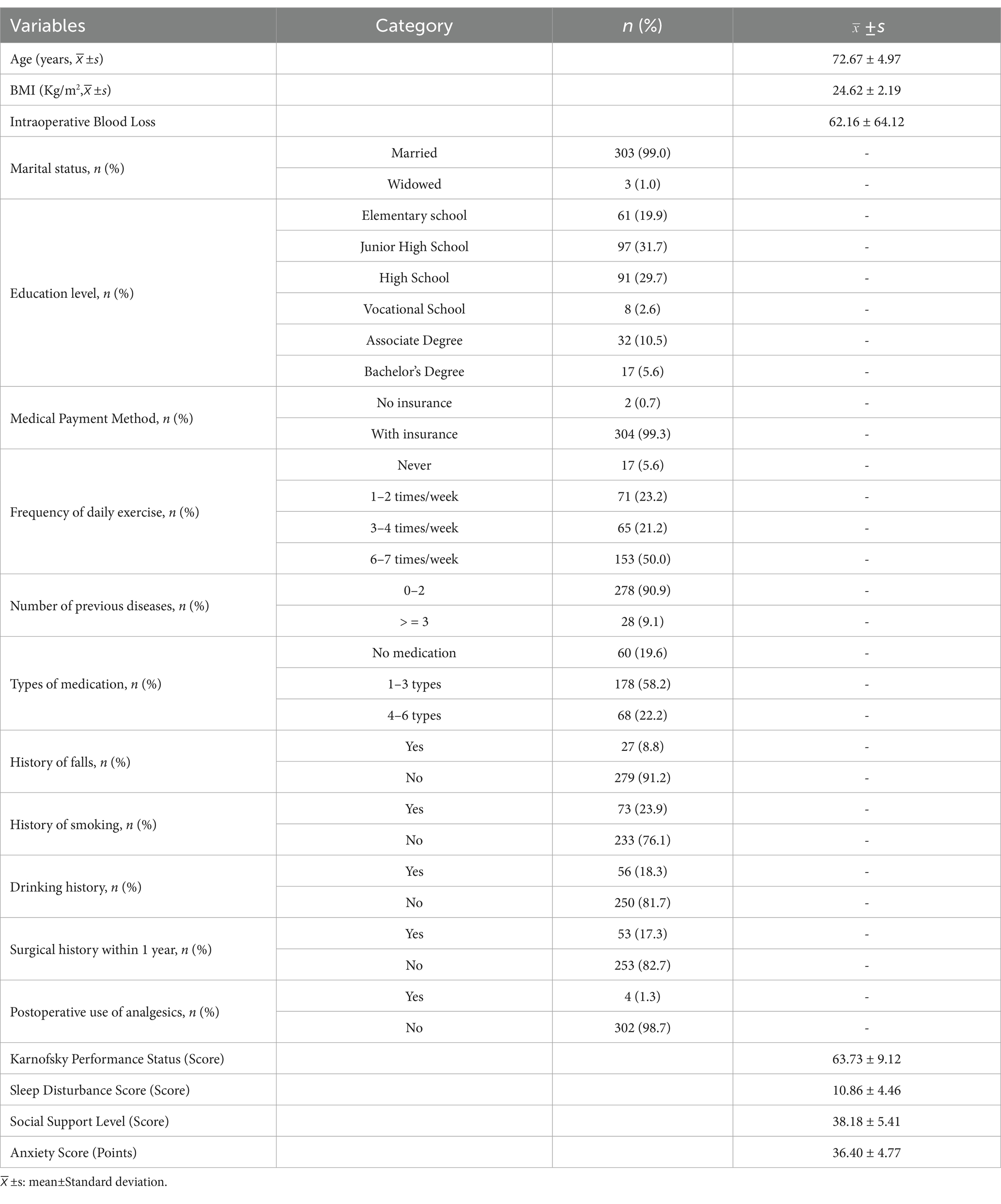 Among the 306 patients, the mean age was 72.67 ± 4.97 years, and the mean body mass index (BMI) was 24.62 ± 2.19 kg/m2. The average intraoperative blood loss was 62.16 ± 64.12 ml. With regard to marital status, 303 patients (99.02%) were married and 3 (0.98%) were widowed. In terms of educational attainment, 61 patients (19.9%) had completed primary school, 97 (31.7%) junior high school, 91 (29.7%) senior high school, 8 (2.6%) technical secondary school, 32 (10.5%) college, and 17 (5.6%) held a bachelor’s degree. A total of 304 patients (99.35%) had medical insurance coverage, while 2 (0.65%) did not. Regarding physical activity, 17 patients (5.6%) reported no regular exercise, 71 (23.2%) exercised 1–2 times per week, 65 (21.1%) exercised 3–4 times per week, and 153 (50.0%) exercised 6–7 times per week. In terms of comorbidities, 278 patients (90.0%) had 0–2 pre-existing chronic conditions, while 28 (9.1%) had three or more. Medication use included 60 patients (19.6%) who took no medications, 178 (58.2%) who used 1–3 types, and 68 (22.2%) who used 4–6 types. A history of falls within the past year was reported by 27 patients (8.8%), whereas 279 (91.2%) reported no such history. With respect to lifestyle factors, 73 patients (23.9%) were current smokers and 233 (76.1%) were non-smokers; 56 (18.3%) consumed alcohol regularly, while 250 (81.7%) did not. Fifty-three patients (17.3%) had undergone surgery within the previous year, compared to 253 (82.7%) who had not. Postoperative analgesic use (excluding routine patient-controlled analgesia pumps) was documented in 4 patients (1.3%), with 302 (98.7%) not receiving additional pain medication. The mean Karnofsky Performance Status score was 63.73 ± 9.12; the mean Sleep Disorder Scale score was 10.86 ± 4.46; the Social Support Rating Scale yielded a mean score of 38.18 ± 5.41; the Anxiety Self-Rating Scale score averaged 36.40 ± 4.77 (Table 1).