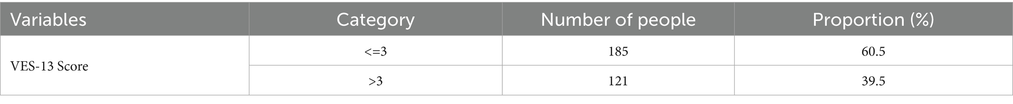 The sample size was calculated based on Kendall’s principle (8), with the sample size being at least 5 ~ 10 times the number of independent variables. This study included 26 influencing factors. Considering a 20% error rate and missing data, the sample size was calculated to be between 156 and 312 cases. A total of 315 questionnaires were distributed in this study, with nine invalid questionnaires excluded, resulting in 306 valid questionnaires returned, yielding an effective return rate of 97.14%. This study has been approved by the hospital ethics committee (approval number: 2024-Y-306), and all participants provided informed consent and voluntarily participated in the study.