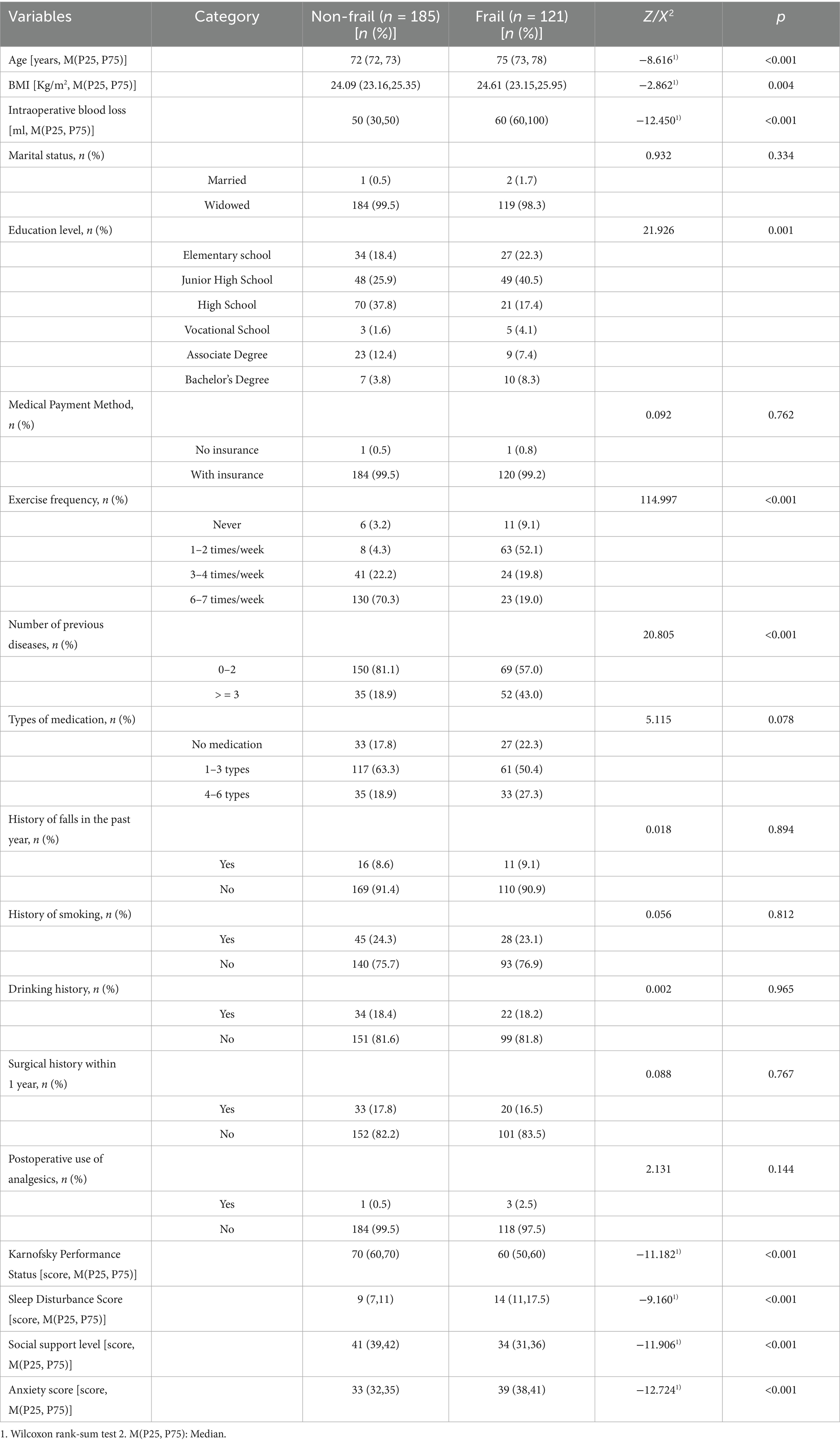 The results showed that there were no statistically significant differences between the frailty group and the non-frailty group in terms of marital status, method of medical payment, types of medication, history of falls within 1 year, smoking, drinking, history of surgery within 1 year, and use of pain medication (p > 0.05). Statistically significant differences were observed in age, BMI, intraoperative blood loss, educational level, number of pre-existing conditions, frequency of daily exercise, KPS functional status, sleep disorders, social support, and anxiety (p < 0.05) (Table 3).