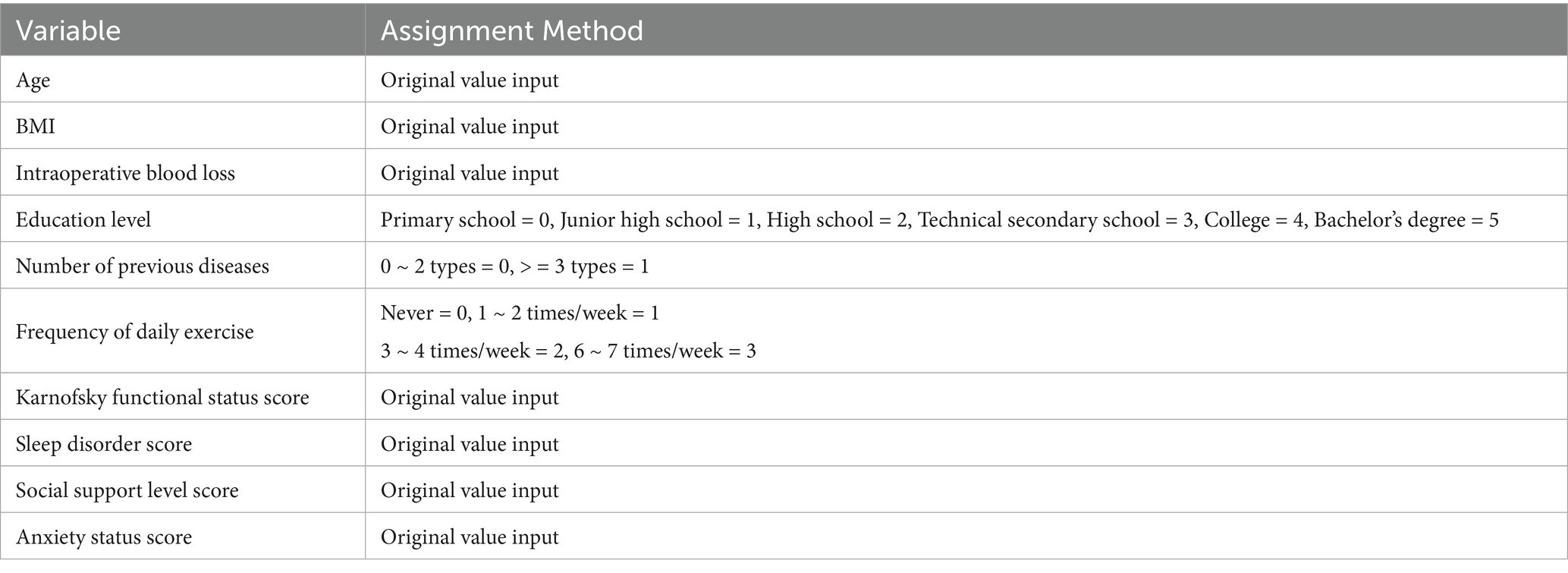This study employed paper-based questionnaires, which were administered by two pre-trained researchers in the relevant departments. Prior to the survey, the research objectives, methods, and significance were explained to the patients. General information was obtained on the day of admission; intraoperative blood loss and pain medication usage were obtained from postoperative medical records; the Frailty Assessment Scale, KPS Functional Status Scale, Sleep Disorder Scale, Social Support Assessment Scale, and Anxiety Self-Rating Scale were assessed on the fourth day postoperatively; the Frailty Assessment Scale was used to assess preoperative frailty within 1–2 days of admission. Completed questionnaires were collected on-site, reviewed for completeness, and ensured to be intact. Data were entered after being verified by a third party.
