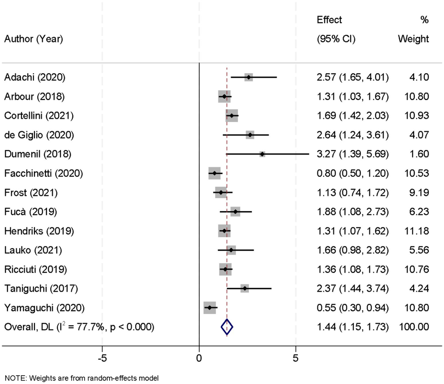 Forest plot showing the effect of glucocorticoid administration on progression-free survival (PFS) in patients treated with immune checkpoint inhibitors (ICIs).