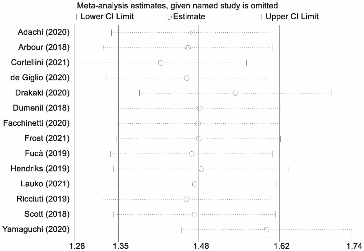 Thirteen studies contributed data on progression-free survival (PFS) comparing patients who received glucocorticoids with those who did not. Owing to significant heterogeneity among these studies (I2 = 77.7%, p < 0.001), a random-effects model was applied to pool the results. The combined analysis yielded a pooled HR of 1.44 (95% CI, 1.15–1.73; p < 0.001), indicating that glucocorticoid use was associated with a significantly increased risk of disease progression relative to non-use (Figure 2). To ensure the robustness of this finding, a sensitivity analysis was performed by sequentially excluding each study. This leave-one-out analysis confirmed that the overall PFS result remained stable and robust, demonstrating that the pooled effect estimate was not unduly influenced by any single study (Figure 3).