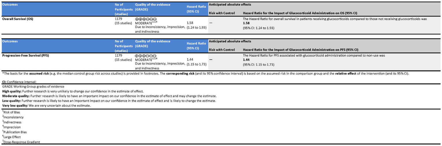 Fifteen studies involving 5,950 patients were included. Glucocorticoid use was significantly associated with inferior outcomes. The pooled HR for PFS was 1.44 (95% CI, 1.15–1.73; p < 0.001; I2 = 77.7%), and for OS was 1.58 (95% CI, 1.24–1.93; p < 0.001; I2 = 84.2%). Subgroup analysis demonstrated that post-ICI glucocorticoid administration was strongly associated with poorer survival (PFS: HR = 1.98, 95% CI, 1.51–2.62; OS: HR = 2.28, 95% CI, 1.61–3.41; both p < 0.001), while pre-ICI use showed no significant effect (PFS: HR = 1.21, 95% CI, 0.85–2.01; OS: HR = 1.31, 95% CI, 0.69–2.28). Funnel plots and Egger’s regression test indicated no significant publication bias (PFS: p = 0.42; OS: p = 0.37). Evidence certainty for both OS and PFS was rated as moderate.
