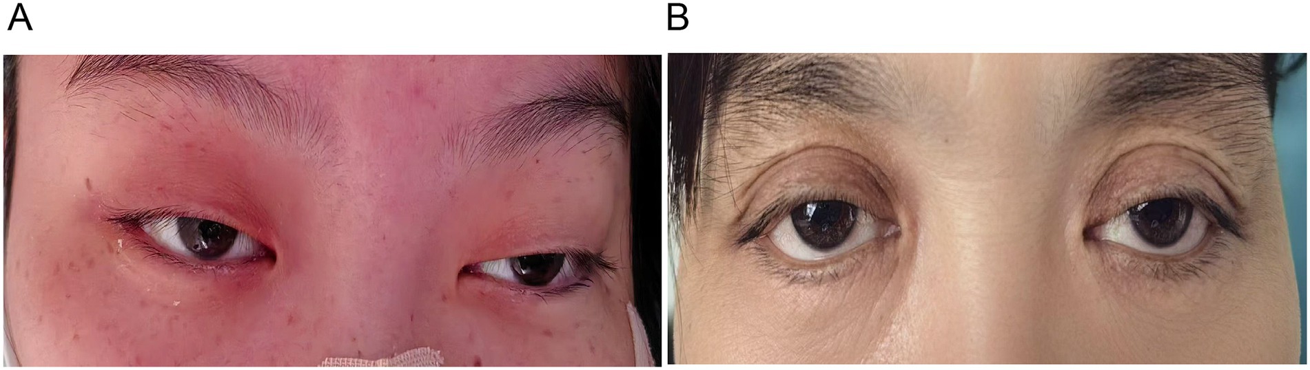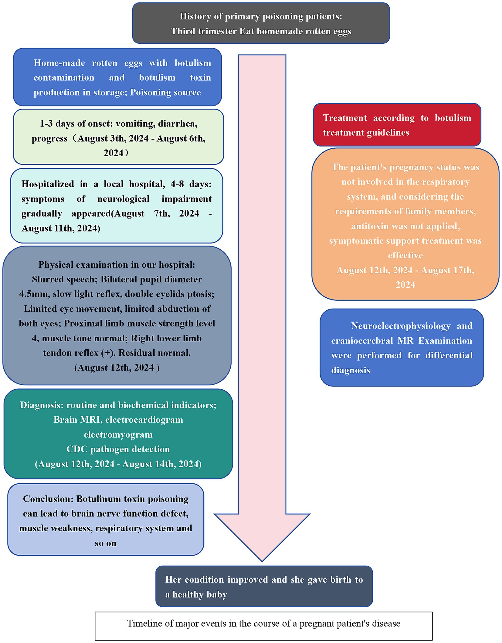 Patient A, a 23-year-old pregnant woman at >35 weeks gestation, was admitted to our hospital on August 12, 2024, with a chief complaint of “intractable vomiting for 3 days, ptosis and weakness of the extremities for 1 week” (Figure 1). Approximately 1 week prior to admission, she experienced postprandial vomiting after consuming homemade spoiled eggs. During the course of her illness, she developed a high-grade fever followed by bilateral ptosis and dysphagia. Three days before admission, her condition worsened, with new-onset limb weakness accompanied by dysphagia and dysarthria, restricted eye movements, and gait instability. She was initially treated at a local hospital, where she received comprehensive care including fluid replacement, electrolyte balance management, and protection of organs. However, the underlying cause was not identified, and treatment was ineffective. She was subsequently referred to our hospital for further evaluation. Based on a detailed review of her medical history, the likely cause of her condition was suspected to be foodborne botulism resulting from the ingestion of improperly preserved homemade eggs. On physical examination, her vital signs were as follows: body temperature, 37.0 °C; pulse rate, 73 beats per minute; respiratory rate, 19 breaths per minute; and blood pressure, 110/75 mmHg. Chest examination revealed symmetrical contours with clear breath sounds in both lungs, without dry or wet rales or wheezes. Cardiac examination showed no protrusion or depression in the precordial area, a normal apical impulse, regular heart rate, and no murmurs heard in any valvular areas. Bilateral arterial pulses were symmetrical, regular, and of moderate intensity. Abdominal examination showed distension without rash, hyperpigmentation, or varicose veins on the abdominal wall. There was no tenderness, rebound tenderness, or abdominal vascular murmurs, and bowel sounds were normal. Neurological examination revealed that pupils were isochoric, measuring approximately 5 mm in diameter, with sluggish response to light stimulation and bilateral ptosis graded at level IV-V (Figure 2A). Restricted ocular motility was observed bilaterally, with marked limitation of abduction. Deep tendon reflexes were normal in both upper limbs but exaggerated in the right lower limb; no responses were elicited in the left lower limb. Her family history was negative for hereditary disorders and infectious diseases. No abnormalities were noted in her psychological history.