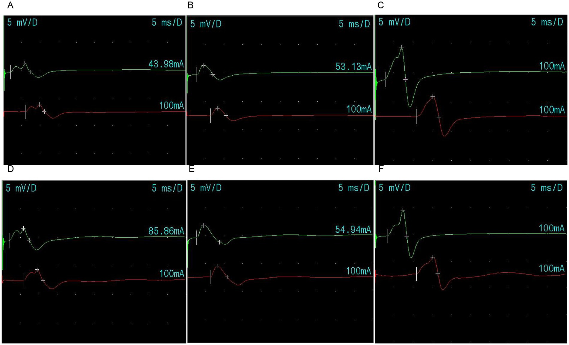 Figure 3. Electromyography results: (A) right ulnar nerve damage; (B) right median nerve damage; (C) right tibial nerve normal; (D) left ulnar nerve damage; (E) left median nerve damage; (F) left tibial nerve normal.