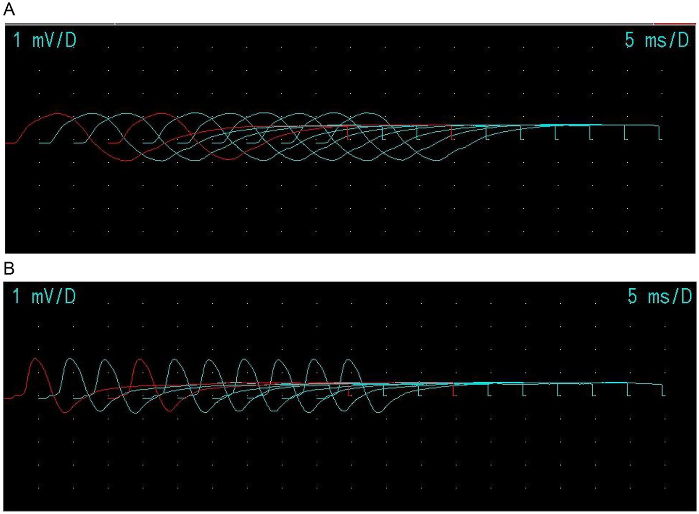 Biochemical tests revealed hyponatremia, hypokalemia, and hyperchloremia. Electromyography (EMG) showed damage to the motor branches of the bilateral median and ulnar nerves, with abnormal F-waves (late motor responses) in both nerves (Figure 3). Low-frequency stimulation induced muscle contractions with atypical traits (Figure 4). The examination was interrupted due to limb tremors and uterine contractions in the late stage of pregnancy, and thus no images were captured during high-frequency stimulation. Food samples (“Homemade rotten eggs”) submitted for testing at the Center for Disease Control and Prevention yielded a positive result for C. botulinum type A. The patient developed symptoms 12 h after ingestion. During the initial phase, she remained conscious and exhibited no sensory abnormalities. Subsequently, she developed ptosis, restricted extraocular muscle movement, symmetrical pupil dilation, and delayed pupillary light reflexes. In the later phase, dysphagia, limb weakness, and slurred speech were noted. Cranial magnetic resonance imaging (MRI) showed no abnormalities. Based on the characteristic clinical presentation and detection of botulinum neurotoxin type A, the case was definitively diagnosed as foodborne botulism.