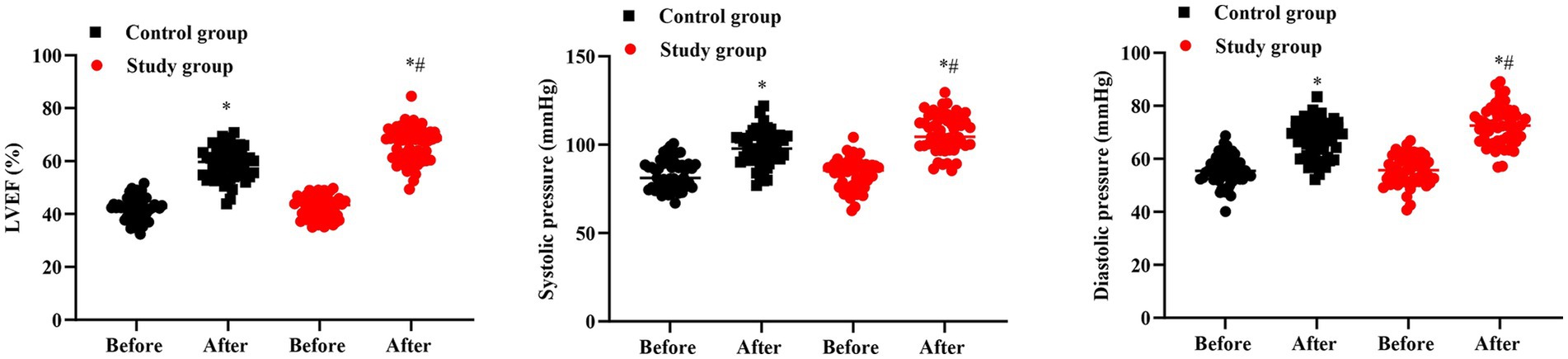 Figure 1. LVEF and blood pressure in 2 groups. #p < 0.05, in contrast to before intervention, *p < 0.05, in contrast to control group.