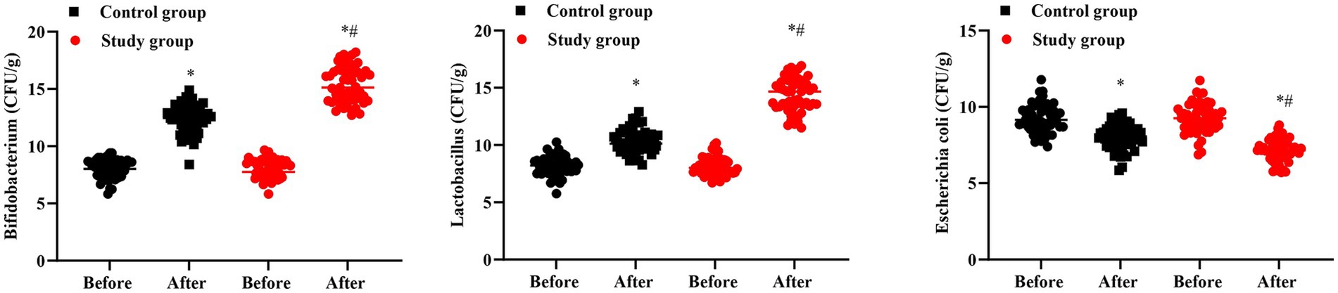 Figure 6. Number of intestinal flora in 2 groups. #p < 0.05, in contrast to before intervention, *p < 0.05, in contrast to control group.