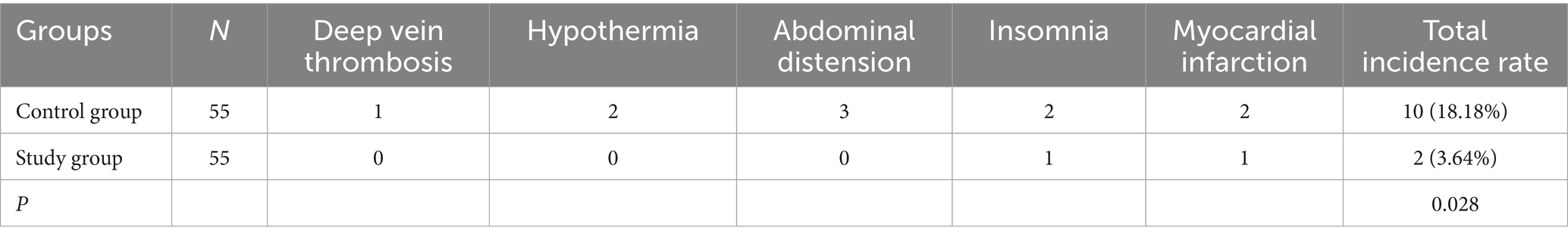 6. The incidence of postoperative adverse reactions (deep vein thrombosis, hypothermia, abdominal distension, insomnia and myocardial infarction) in 2 groups was observed.