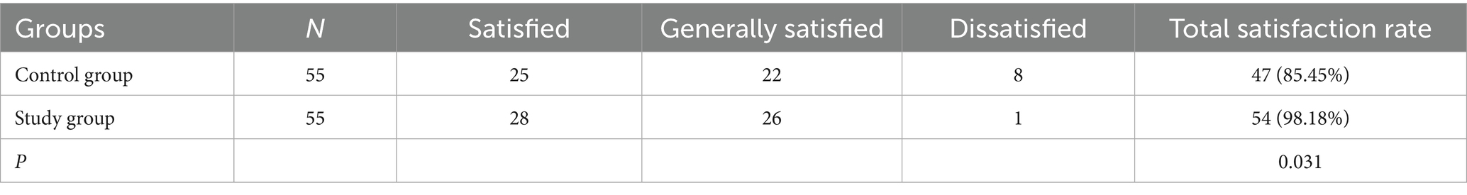 7. The nursing satisfaction questionnaire survey scale made by the hospital was adopted for assessing nursing satisfaction of patients, including nurse–patient communication, service skills, nursing knowledge, and health education. The highest score was 100, the lowest score was 0, ≥80 indicated satisfaction, <60 indicated dissatisfaction, and others indicated general satisfaction. Total satisfaction rate (%) = (number of satisfied cases + number of generally satisfied cases) ÷ Total number of cases ×100%.