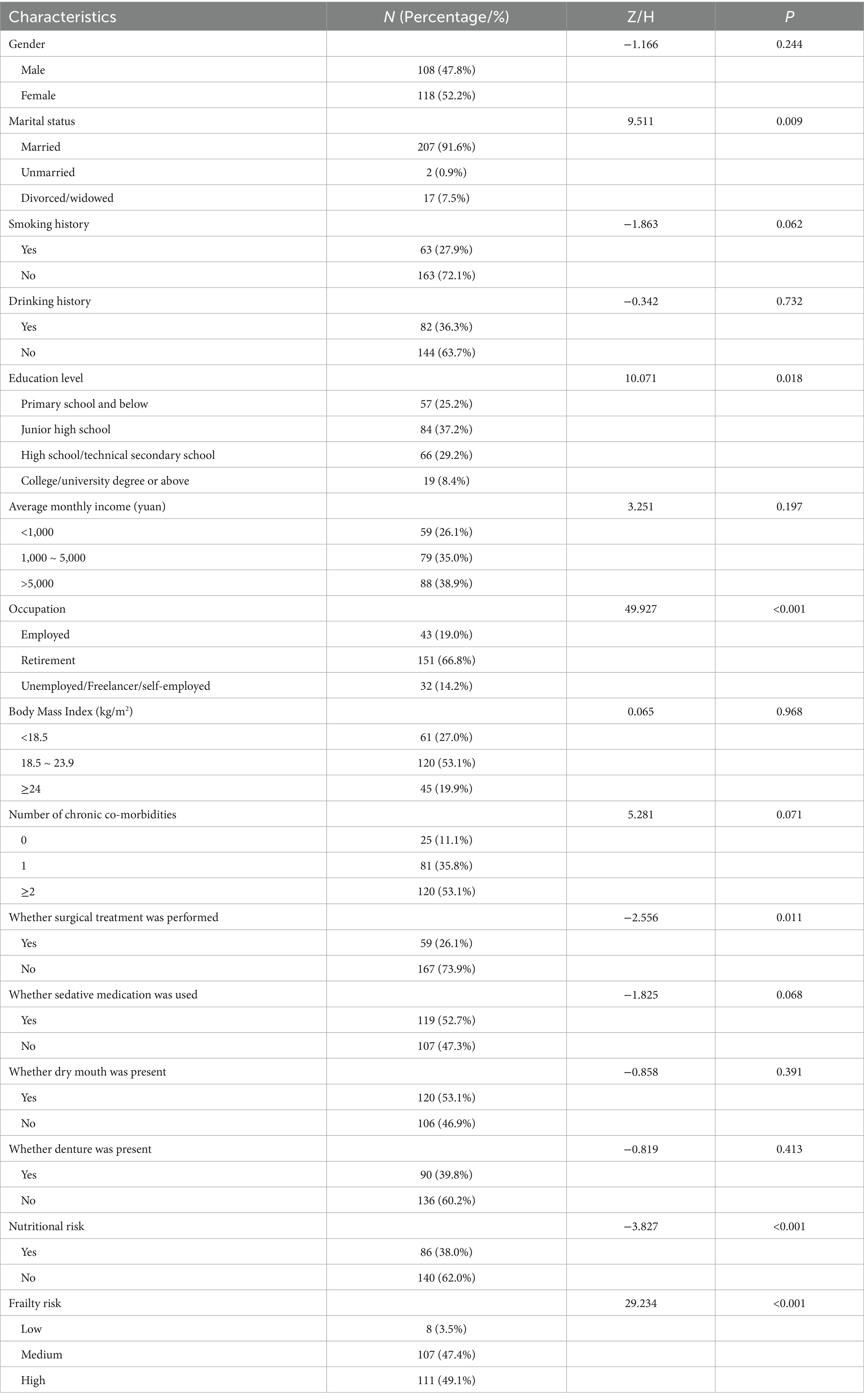 Studies show that the incidence of oral frailty in China is higher than that in developed countries such as Japan (13). This might be due to differences in healthcare, culture, etc., or perhaps because of variations in research methodologies (14). Oral frailty has a significant impact on the health, possibly increasing the risk of physical frailty, disability and death, and is closely related to muscle loss, cognitive decline and deterioration of quality of life (15–17). By assessing the oral frailty of patients, it can help us identify the risk of their death at an early stage (18). Studying the occurrence of oral frailty and intervention measures is of great significance for improving the oral health of patients, enhancing their quality of life and delaying aging. At present, China pays more attention to the physical, psychological and cognitive frailty of patients, but the research on oral frailty is relatively insufficient. Dibello et al. (19) pointed out that decreased chewing ability, difficulty in swallowing and tooth loss are the main characteristics of oral frailty. These problems can significantly affect the daily living ability of patients and increase the risk of physical frailty. Another study also found that poor oral health is significantly associated with frailty, with tooth loss and chewing difficulties being key risk factors (20). Research (21) shows that the oral environment and function affect the recovery of the body and are even related to the daily activities of patients after discharge. Therefore, paying attention to oral conditions can not only effectively prevent complications such as ventilator-associated pneumonia (22), but also be conducive to promoting the recovery of patients.