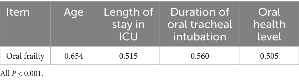 3.3 Oral frailty score of ICU patients with oral endotracheal intubation, and correlation analysis with age, length of stay in ICU, duration of oral endotracheal intubation and oral health level