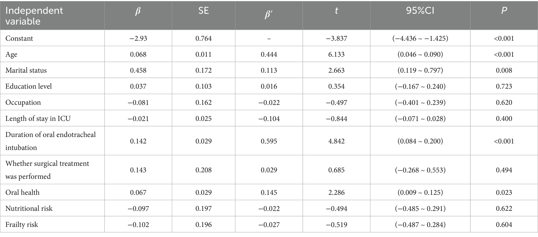 The oral frailty score was used as the dependent variable and the variables with statistically significant differences in the univariate analysis were used as independent variables for multiple linear regression analysis. Age, length of stay in the ICU, duration of oral tracheal intubation and oral health level were brought in as original values. The assignment of values for marital status, educational level, occupation, whether surgical treatment was performed, nutritional risk and frailty risk is as follows (marital status:1 = Married, 2 = Unmarried, 3 = Divorced/widowed; educational level:1 = Primary school and below, 2 = Junior high school, 3 = High school/technical secondary school, 4 = College/university degree or above; occupation:1 = Employed, 2 = Retirement, 3 = Unemployed/Freelancer/self-employed; whether surgical treatment was performed:1 = Yes, 2 = No; nutritional risk:1 = Yes, 2 = No; frailty risk:1 = Low, 2 = Medium, 3 = High). Multiple linear regression showed that age, marital status, duration of tracheal intubation and oral health were the influencing factors of oral frailty in ICU patients with oral endotracheal intubation. Table 3 presents the multiple linear regression analysis results.