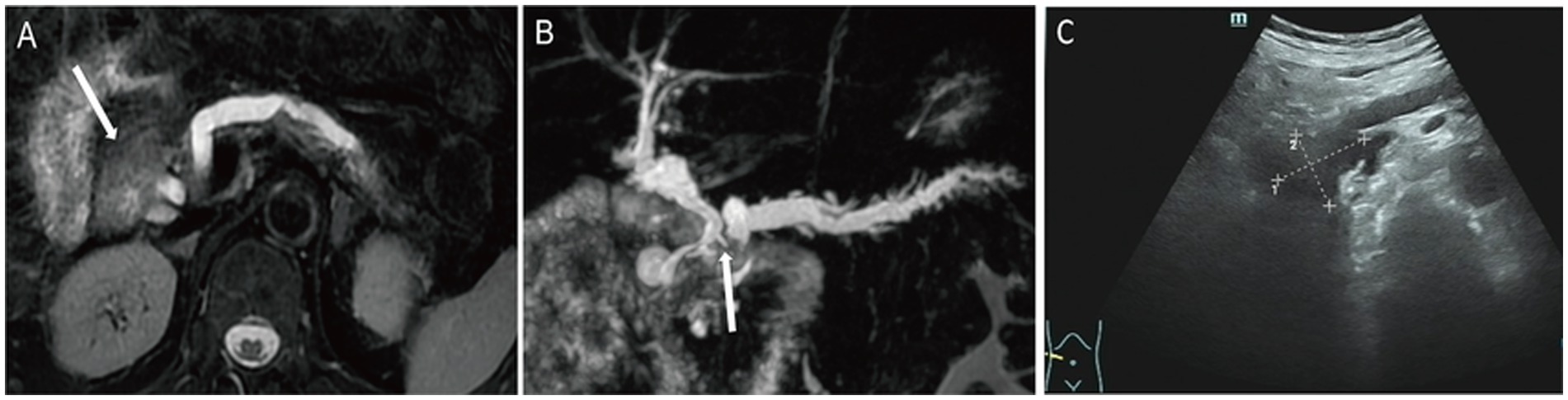Figure 3. Case 3: axial T2WI (A) demonstrated a slightly hyperintense lesion in the pancreatic head, containing internal hypointense septation. On MRCP reconstruction (B), a tumor localized within the main pancreatic duct of the pancreatic head, with marked upstream pancreatic ductal dilation and compression of the common bile duct (white arrow). On US, an anechoic mass (C) was seen in the pancreatic head, which communicates with the pancreatic duct.