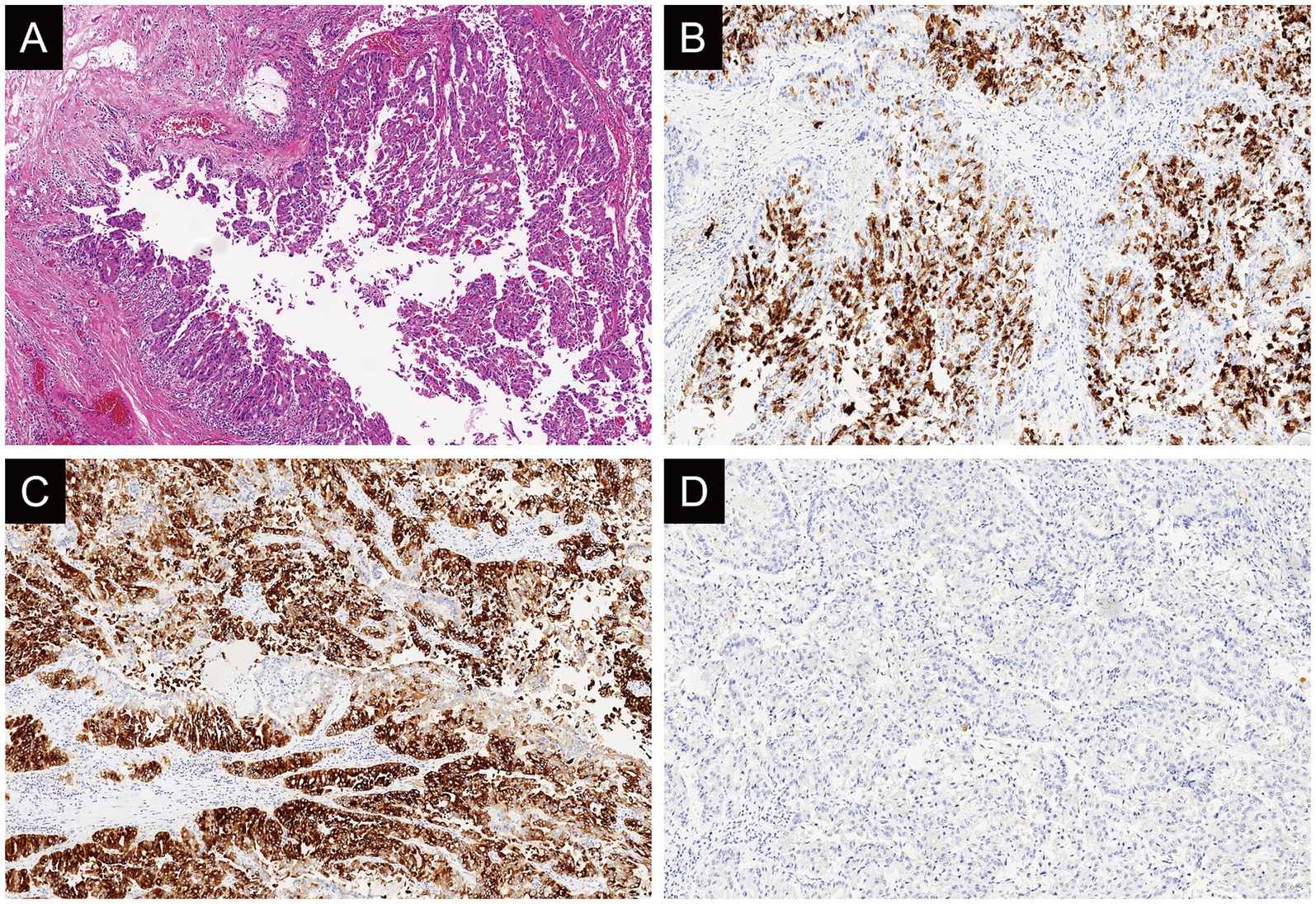 Figure 4. Case 3: histologically (A), the tumor is rich in arborizing papillary architectures composed of oncocytic cells (hematoxylin and eosin stain; original magnification: x4). Immunohistochemically, MUC5AC (B: original magnification, x10) and MUC6 (C: original magnification, x10) exhibits diffuse and strong expression while MUC2 (D: original magnification, x4) is not diffusely expressed in this case.