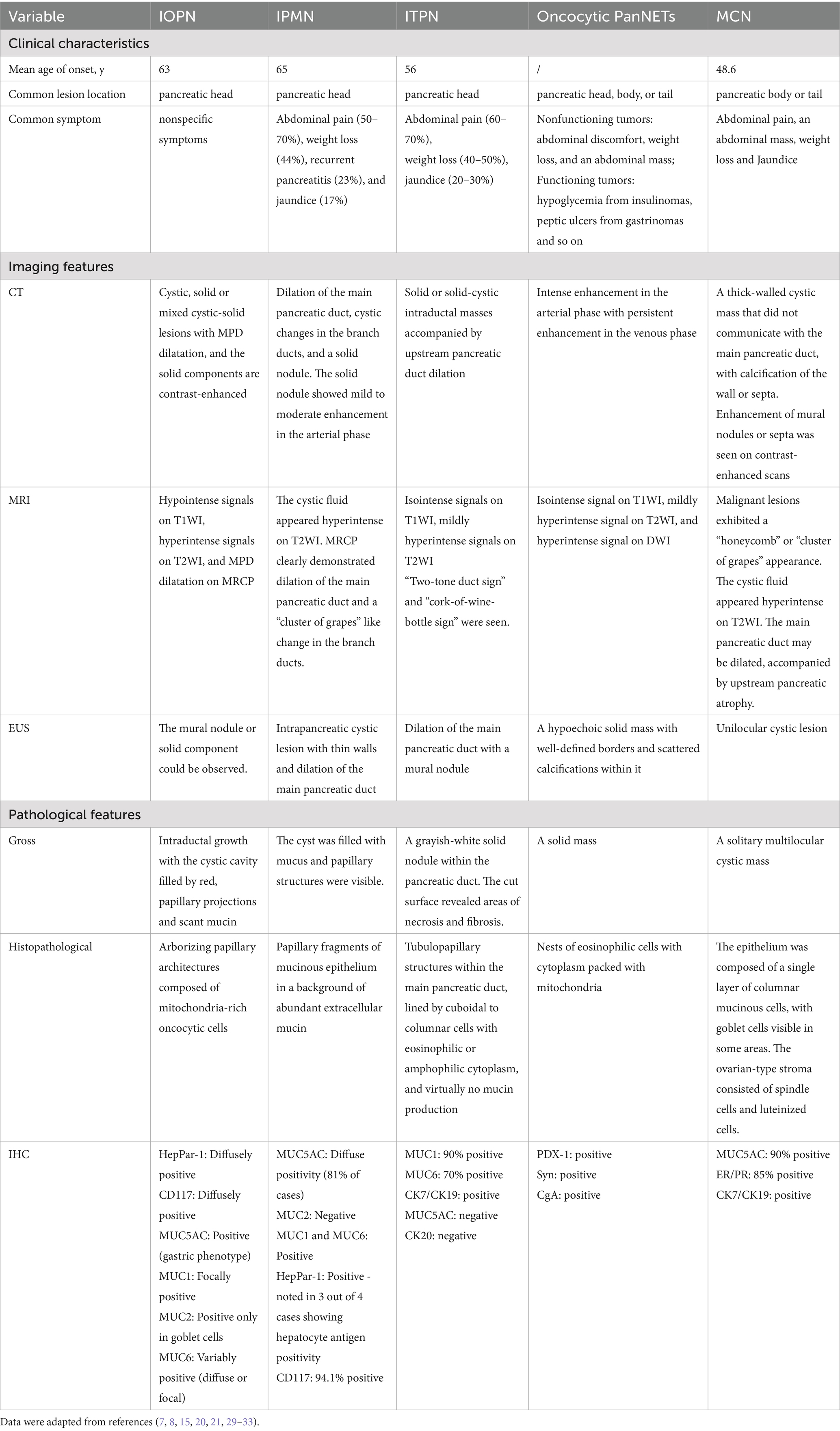 The differential diagnosis of IOPNs mainly includes IPMNs, ITPNs, pancreatic neuroendocrine tumor (PanNET), pancreatic ductal adenocarcinoma (PDAC), and mucinous cystic neoplasm. Table 3 summarized the comparative features of IOPN and other cystic-solid lesions of the pancreas.