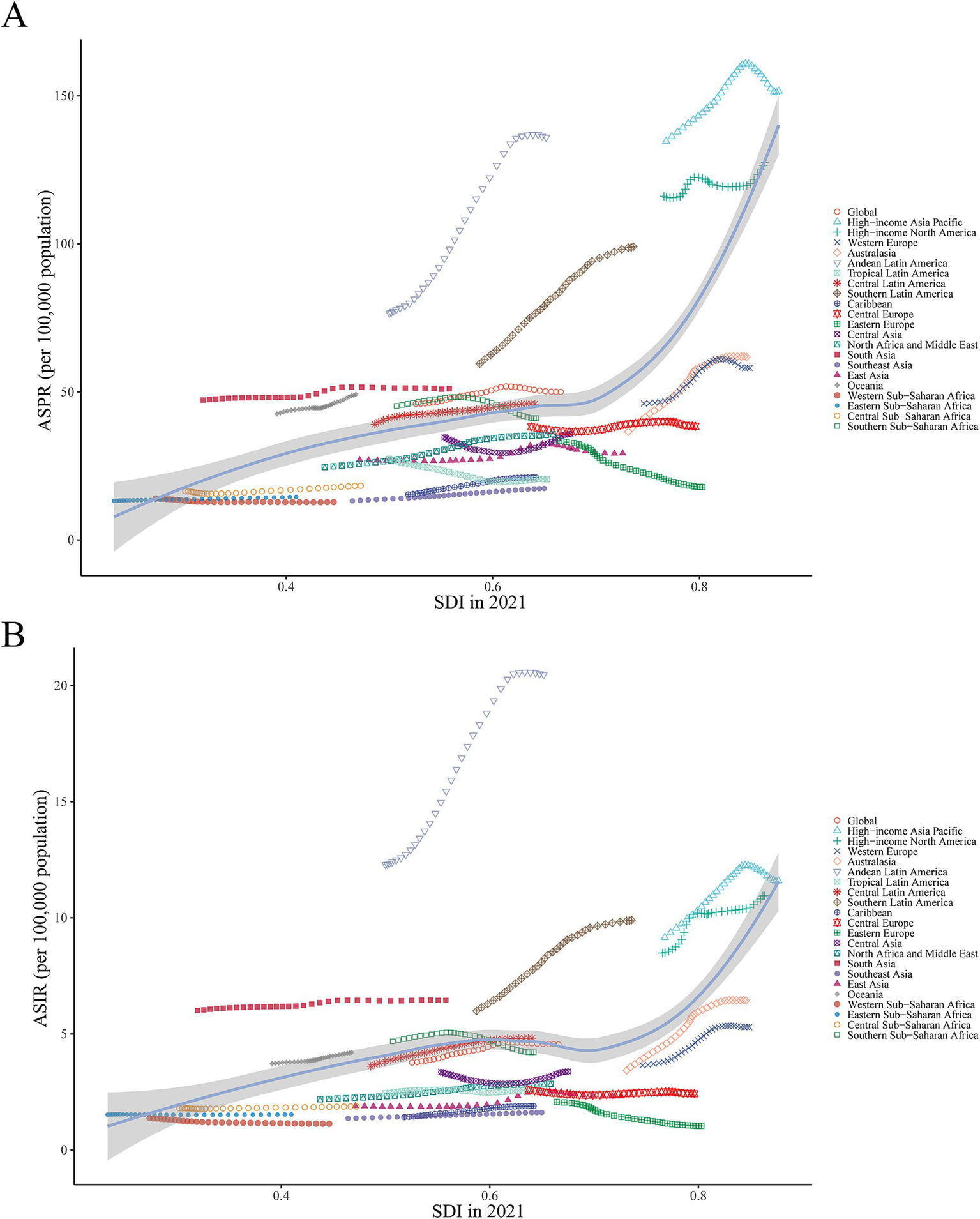 ASPR and ASIR of ILD&PS by SDI in 2021, globally and in 21 regions, 1990 to 2021. (A) ASPR across 21 regions according to SDI in 2021; (B) ASIR across 21 regions according to SDI in 2021. ASPR, Age-standardized prevalence rate; ASIR, Age-standardized incidence rate; ILD&PS, Interstitial lung disease and pulmonary sarcoidosis; SDI, Socio-demographic index.