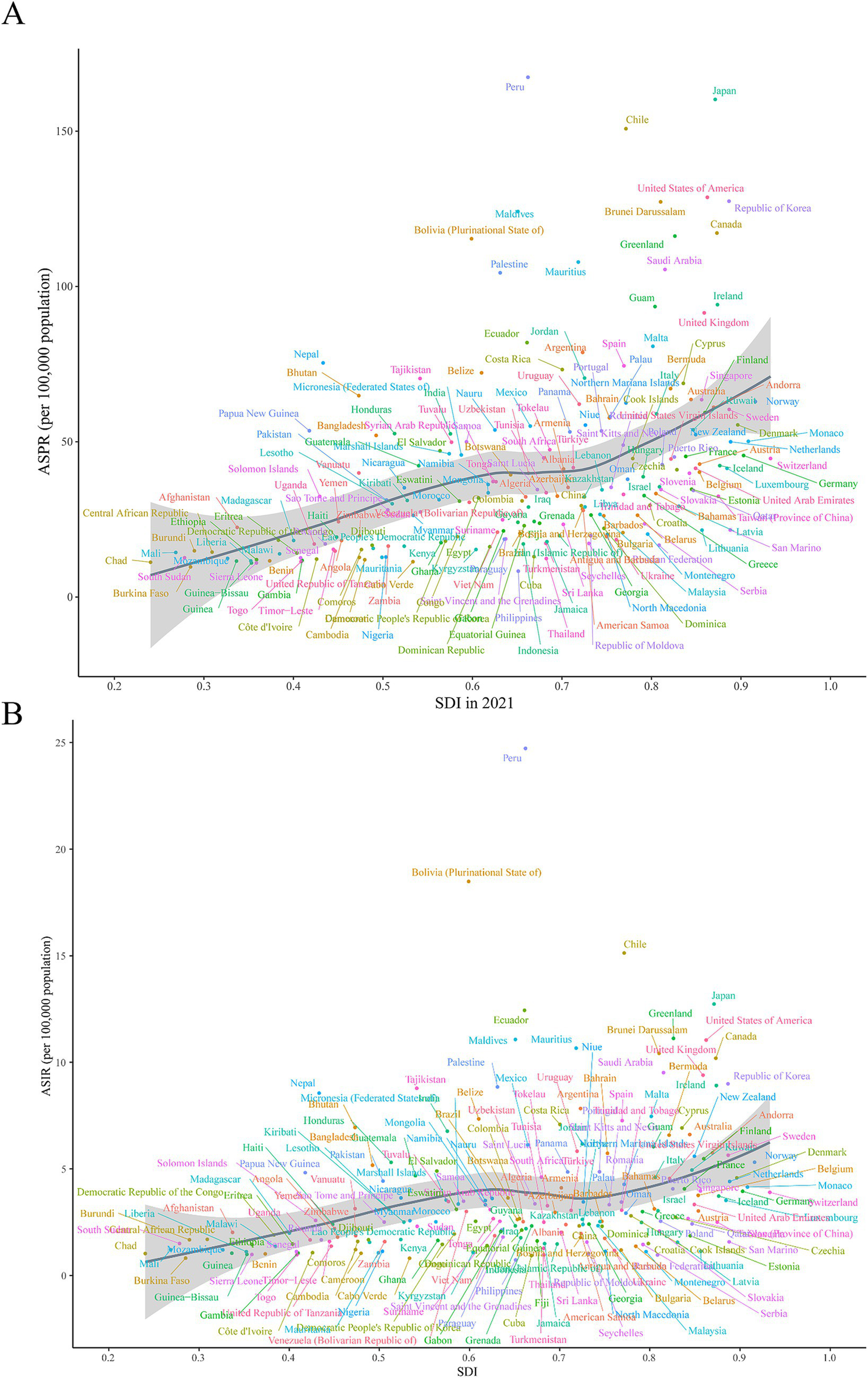 ASPR and ASIR of ILD&PS by SDI in 2021 in 204 countries and territories, 1990 vs. 2021. (A) ASPR in 204 countries and territories; (B) ASIR in 204 countries and territories. ASPR, Age-standardized prevalence rate; ASIR, Age-standardized incidence rate; ILD&PS, Interstitial lung disease and pulmonary sarcoidosis; SDI, socio-demographic index.