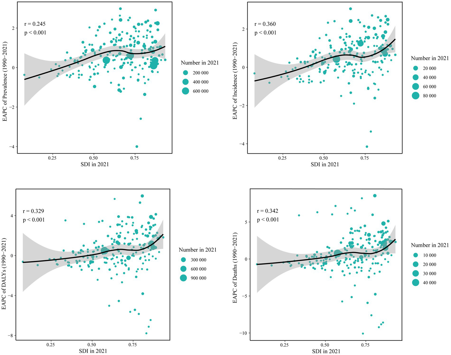 ASPR (p < 0.001, r = 0.57), ASIR (p < 0.001, r = 0.44), ASDR (p < 0.001, r = 0.17) and ASMR (p < 0.001, r = 0.19) were found to positively correlate with SDI at the regional level. South Asia, Oceania, Andean Latin America, and Southern Latin America all had burden values in 2021 that were higher than anticipated for their respective SDI levels. On the contrary, during the measurement period, burden levels were lower than expected for each of the following regions: Western Europe, Tropical Latin America, the Caribbean, Central Europe, Eastern Europe, Central Asia, North Africa, Middle East, Southeast Asia and East Asia (Figure 3; Supplementary Figure S7).