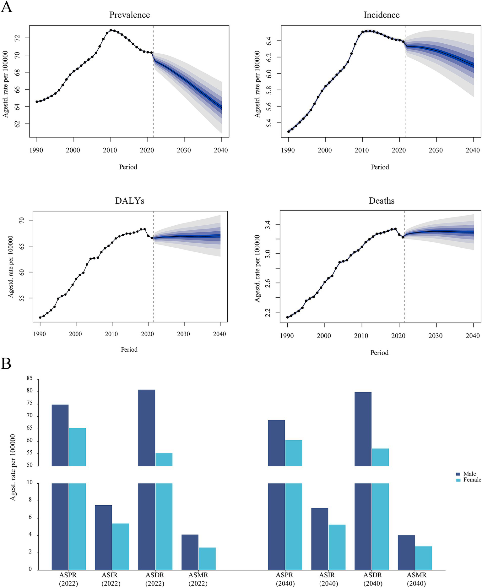Trends in global burden projections for ILD&PS. (A) Prediction of ASR of ILD&PS burdens; (B) Predictions of ASR of ILD&PS burden by gender for 2022 and 2040. ILD&PS, Interstitial lung disease and pulmonary sarcoidosis; DALYs, Disability adjusted life years; ASPR, Age-standardized prevalence rate; ASIR, Age-standardized incidence rate; ASDR, Age-standardized DALYs rate; ASMR, Age-standardized mortality rate.