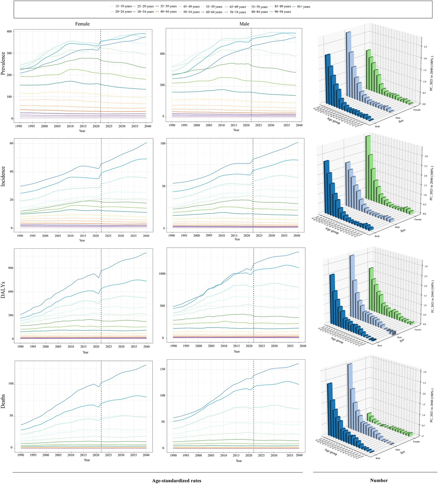 Prevalence, incidence, disability-adjusted life years (DALYs), and deaths were analyzed at global, regional, and national levels using GBD 2021 data. Subgroup analyses were performed by age and gender to assess the quantity of global burden and trends. The BAPC model was used to forecast the worldwide disease load until 2040.
