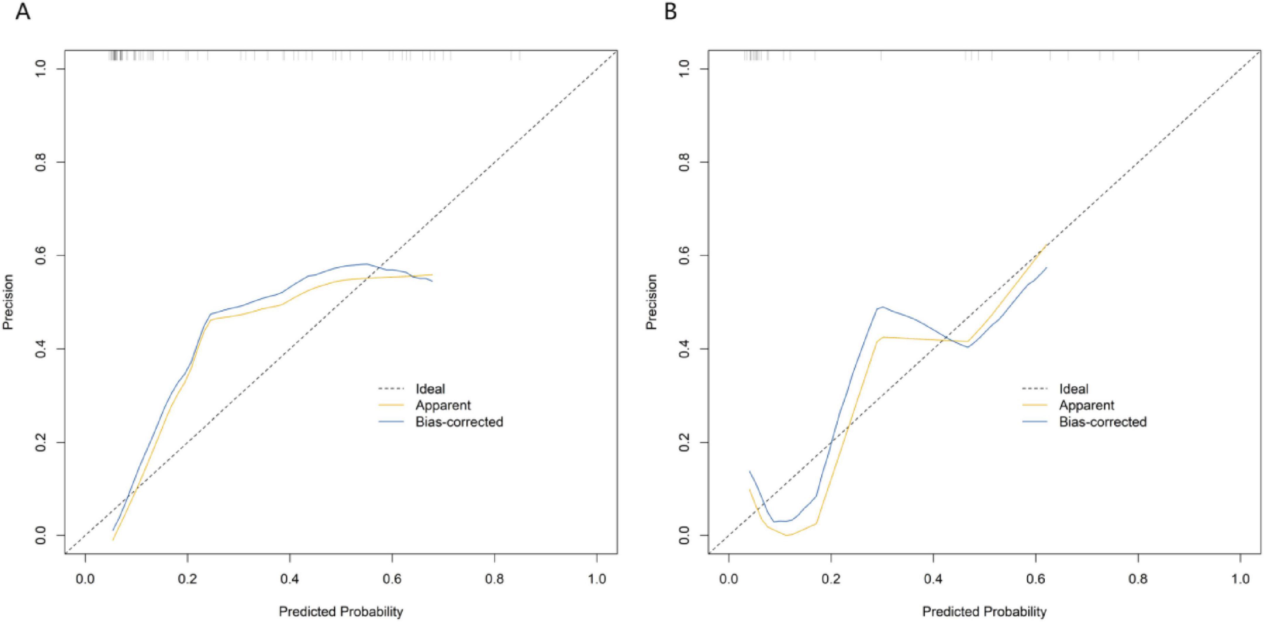Figure 2. Calibration curves in the training set (A) and the validation set (B). The x-axis represents predicted probability of treatment failure; the y-axis represents observed probability. The solid black line (“Ideal”) indicates perfect agreement between predicted and observed values. “Apparent” and “Bias-corrected” curves demonstrate the model’s calibration performance.