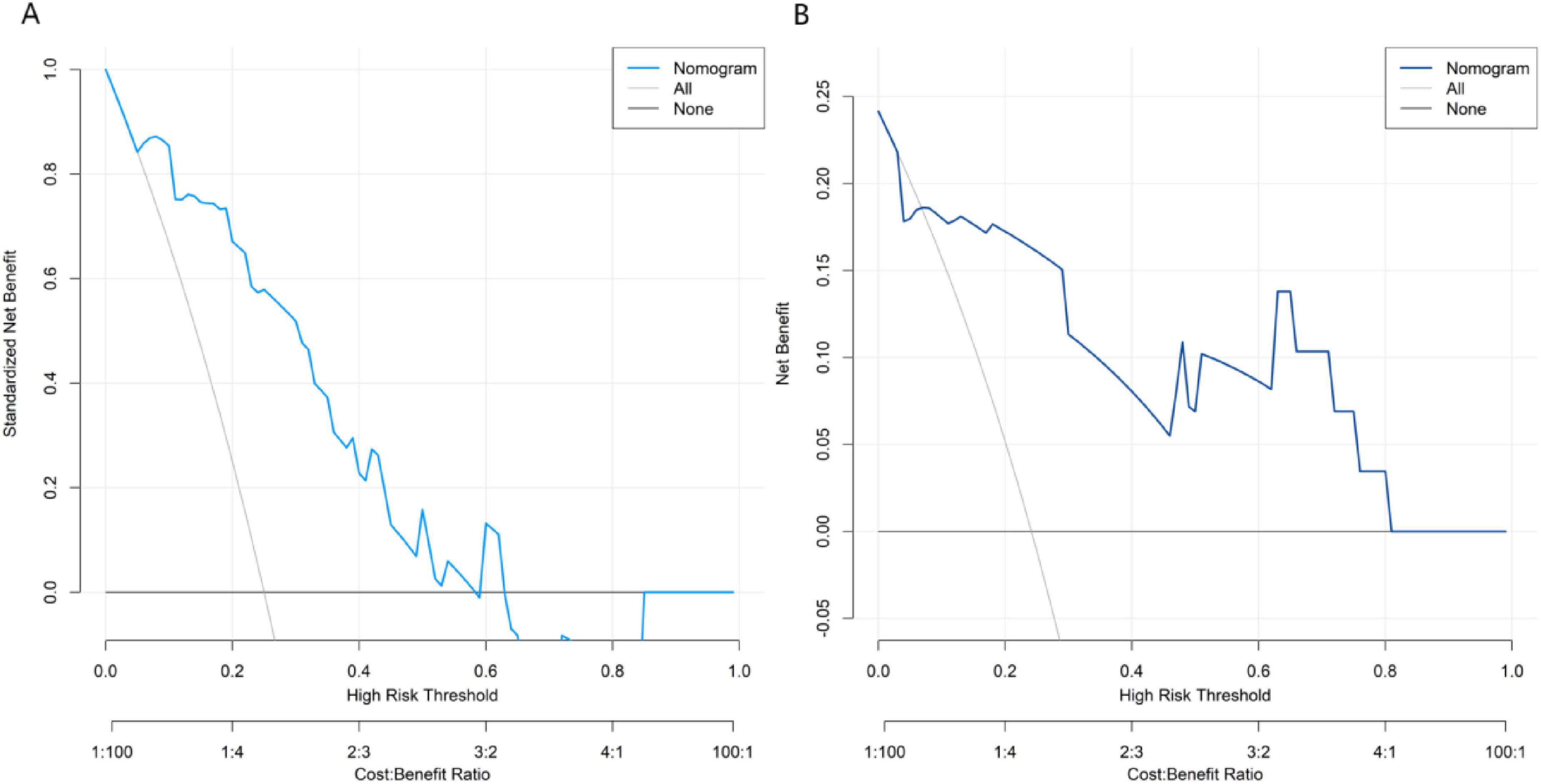 Figure 4. Decision curves in the training set (A) and the validation set (B). The x-axis represents threshold probability of treatment failure; the y-axis represents net benefit.